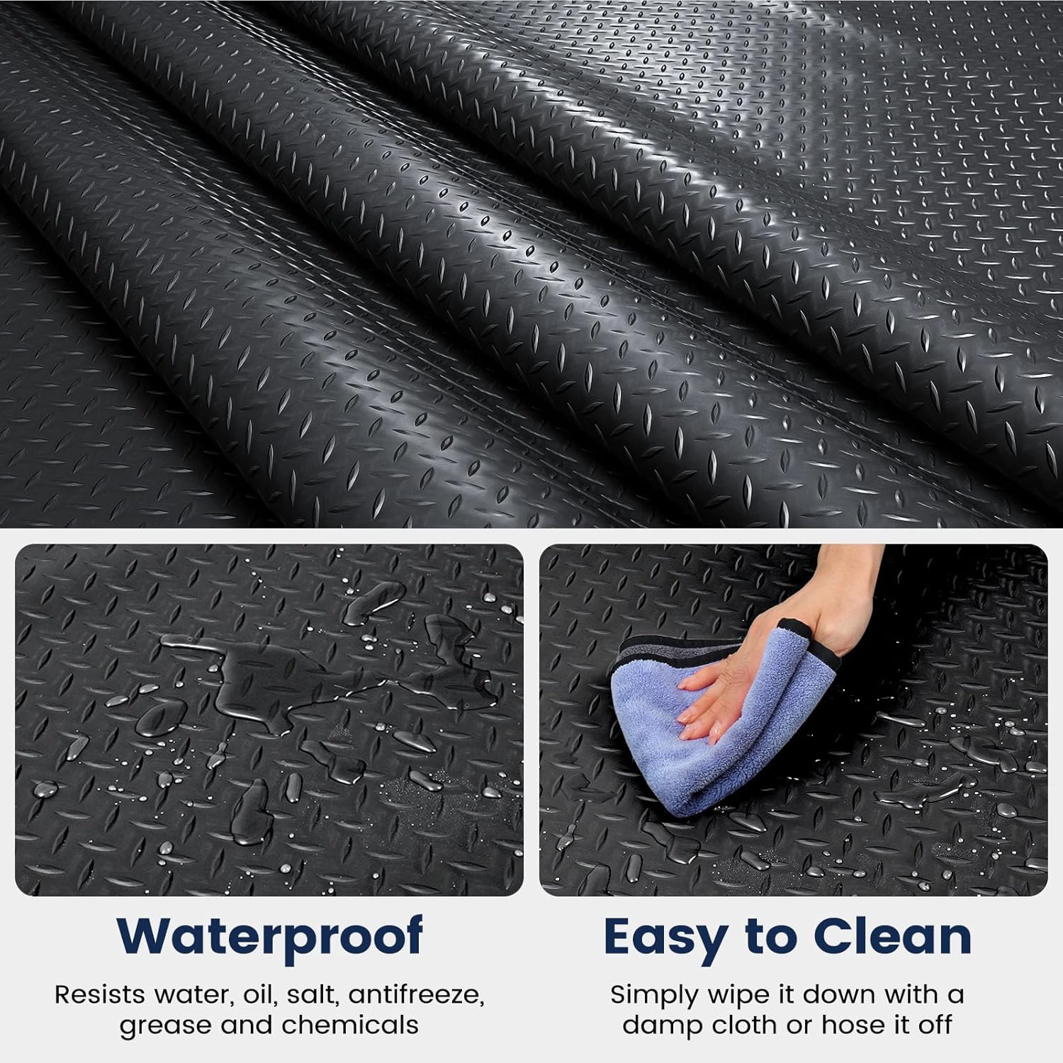 - 【Easy Clean & Protection】Clean with a vacuum, broom, dry mop or a quick hose without removing the garage mat. Protects floors from oil stains, winter salts, rust, moisture at the same time