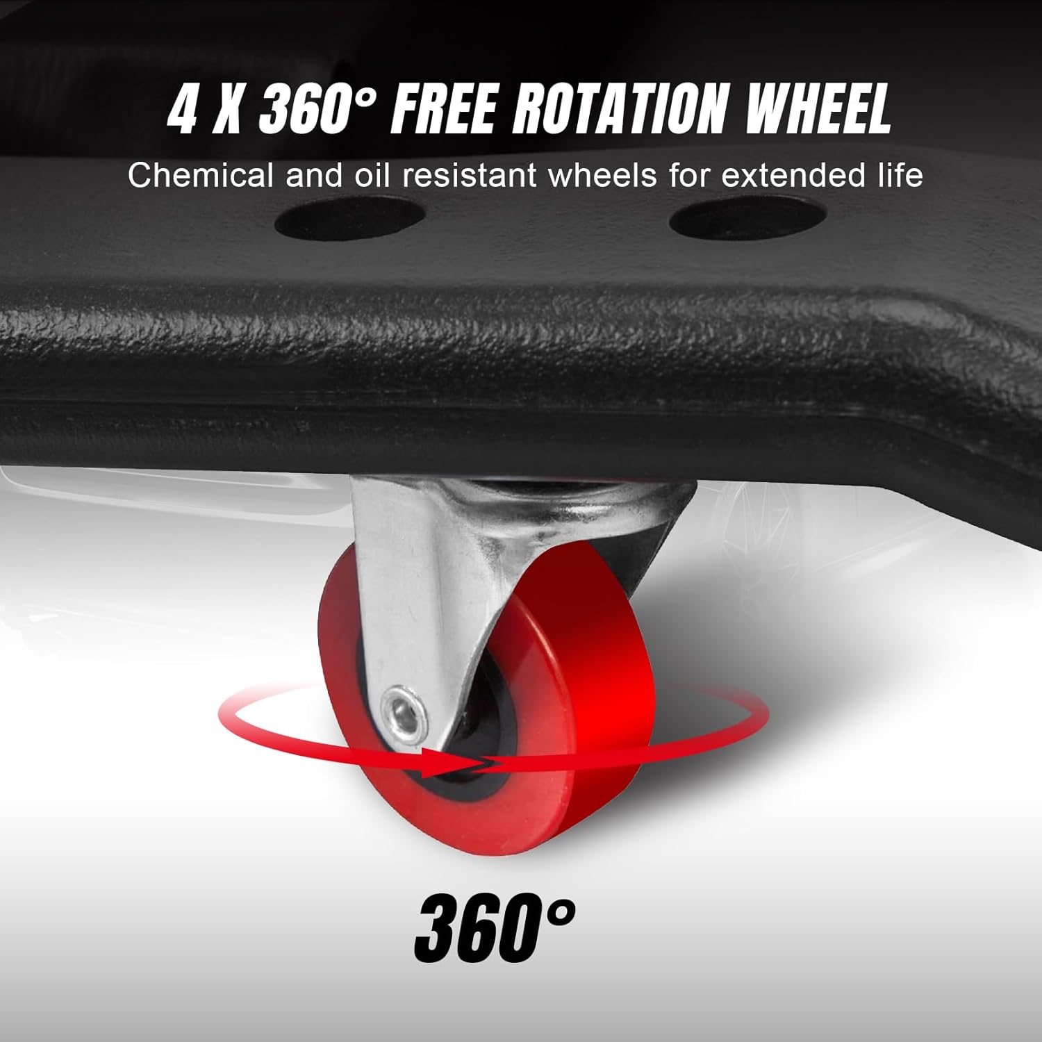 - One-piece, blow molded plastic mechanic cart measuring 36" length and has a low-profile, making it comfortable to work on your car, truck, SUV, van, and more