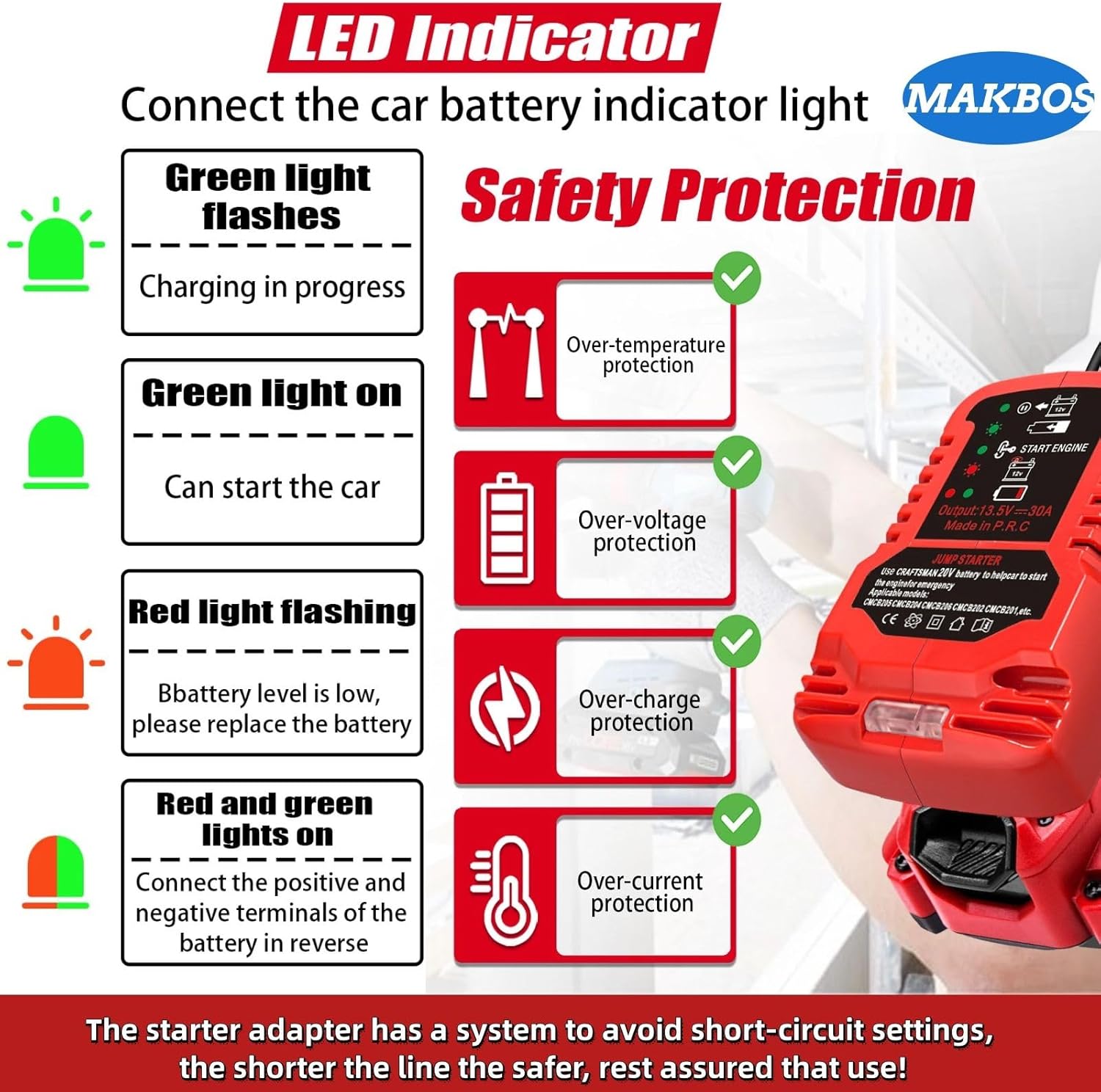 - [Newly Upgraded MAKBOS Jump Starter]: The starter adapter has a system to avoid short-circuit settings, the shorter the line the safer, rest assured that use!The longer the cable, the higher the R, and the risk of short circuit.