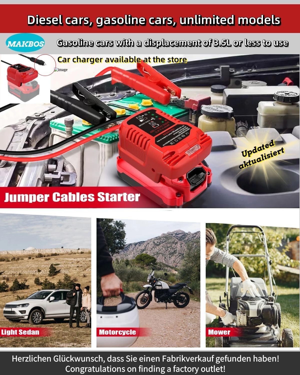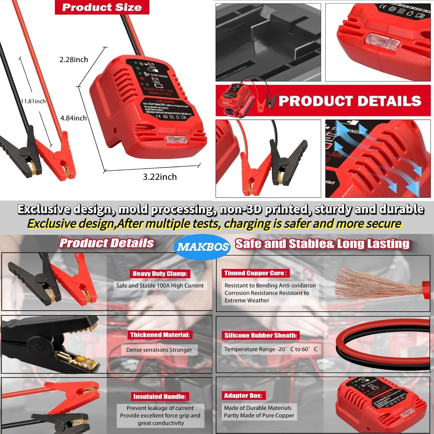 - [Compatible With Craftsman 20V Batteries]: The MAKBOS jump cable Charegr adapter is Assist in starting,compatible with Craftsman batteries 20V lithium-ion batteries,Up to 3.5L Gas or 6.5L Diesel Engines and moreFor Jump Starting Car Using Tool Battery,Engine12V Auto Battery Booster.(Notice:Battery not included).