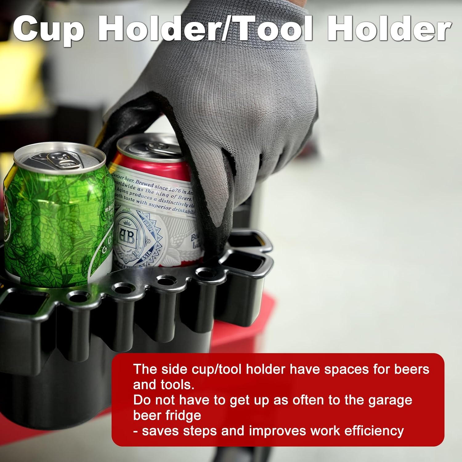 - ăONE tool tray & TWO cup holders/tool holdersăThe garage stool has a very good storage function. There is a tool tray and two cup holders/tool holders. At the same time, the tool tray is equipped with a small partition space. You can put small tools like screws here. When you move, do not worry about the screws slipping out of range. It is convenient to store and access necessary tools and parts at anytime