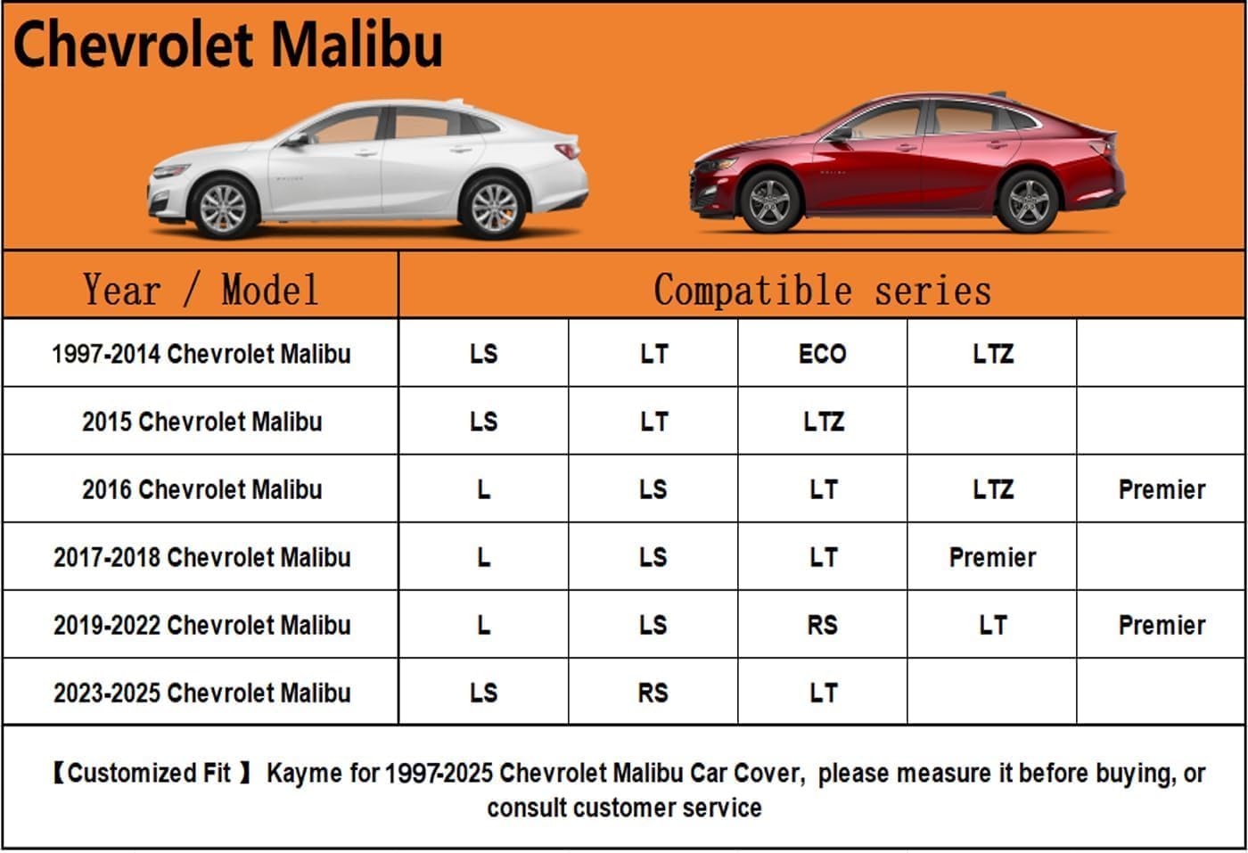• Coverage : Full exterior coverage for Chevrolet Chevy Malibu (1997-2025)