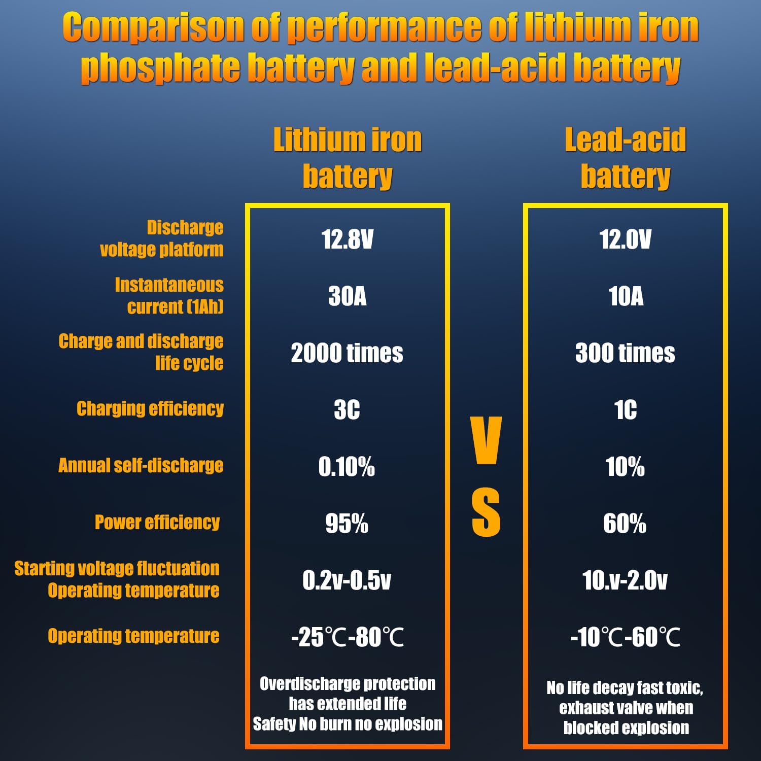 - ăComprehensive LiFePO4 Performance Upgrades, Lightweight and DurableăLiFePO4 batteries are not only lightweight and durable but also feature efficient charging and discharging performance, making them ideal for replacing or upgrading automotive batteries. Adopting LiFePO4 batteries can reduce fuel consumption by up to 20%. Additionally, they come with built-in smart protection circuits to prevent overcharging, over-discharging, and overcurrent, eliminating the need for regular maintenance and addressing long-term inactivity issues