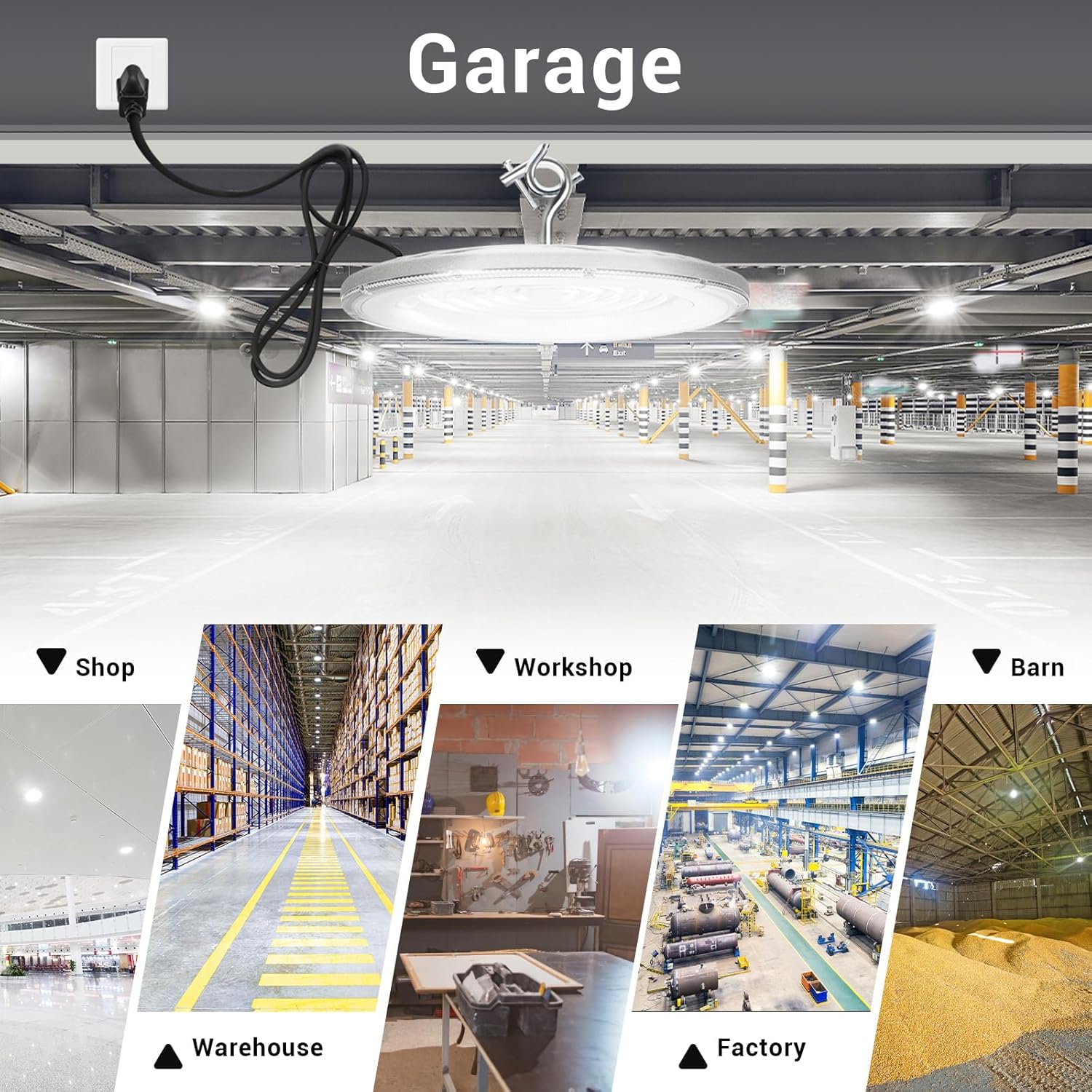 - 【Easy & Quick Installation】This UFO Led High Bay Light can be easily installed in seconds with the 5FT power cord provided and the built-in hook. It comes with US plug with which you can plug to the power directly, safe and secure for extremely easy installation. Ideal indoor lighting,This LED highbay light can work under power supply of AC120V