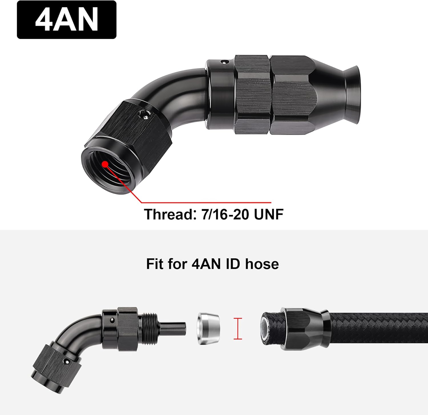 - [Product Size & Parameter] Size: 4AN. Thread Size: 7/16-20 UNF. Working Pressure: 1500PSI. Working Temperature Range: -40°F-250°F. Angle: 60 Degrees. Note: Please verify the hose size before purchase.