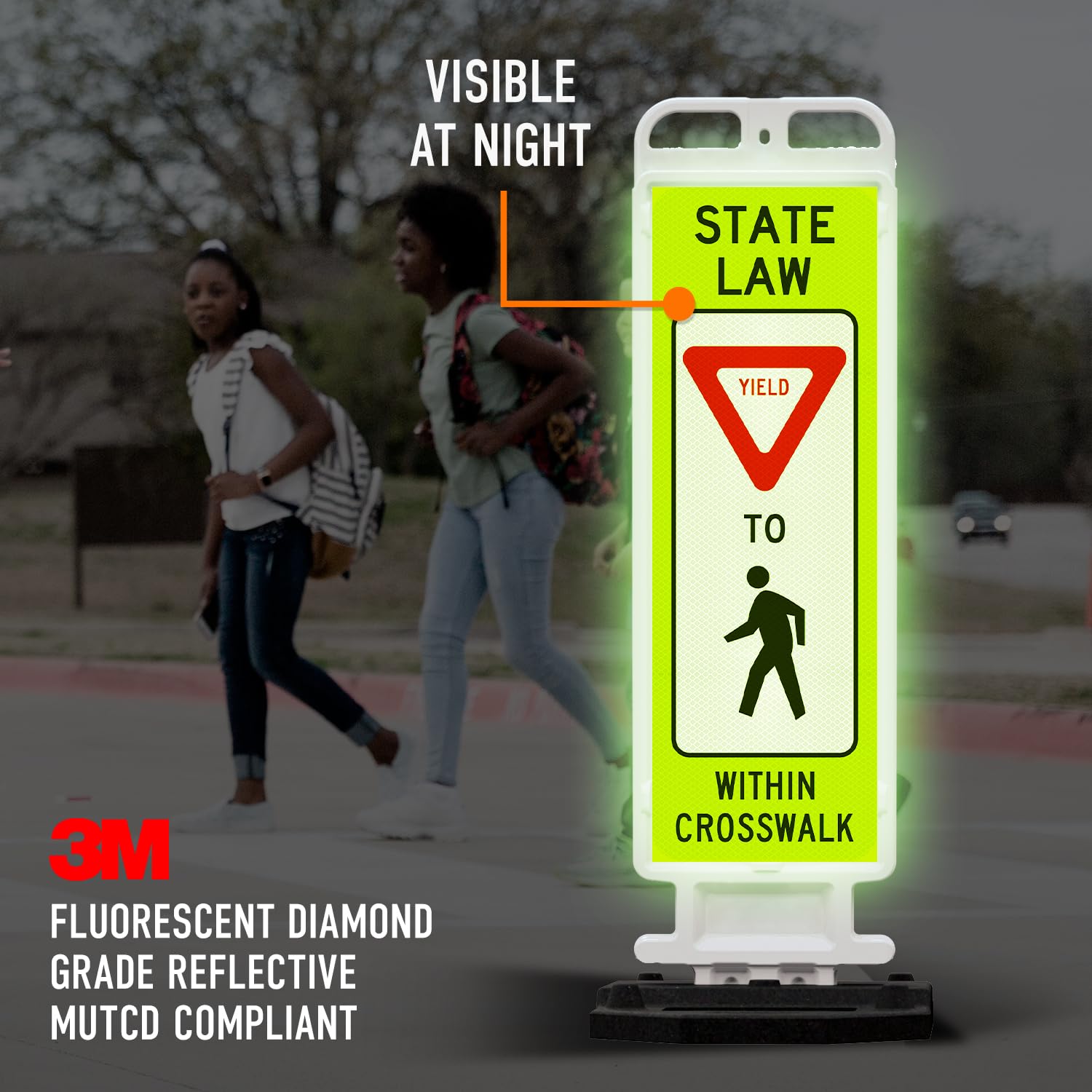 State Law Yield For Pedestrian Within Crosswalk R1-6a MUTCD Sign, Double Sided 3M Engineer Grade Reflective, Portable Rubber Base, Impact Resistant Plastic Frame