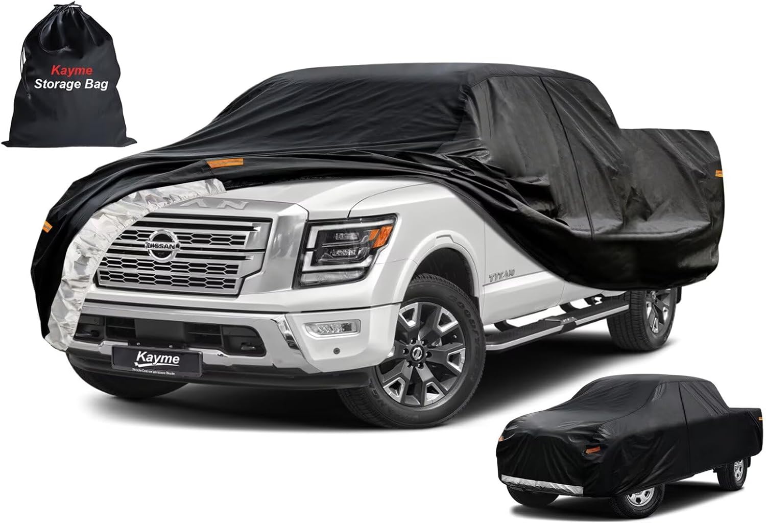 Kayme Truck Cover Custom Fit Nissan Titan(2004-2015) King/Crew Cab Short Bed. Full Exterior Heavy Duty Outdoor Pickup Truck Car Cover Waterproof All Weather.Car Tarp for Wind Sun Dust Protection.Black