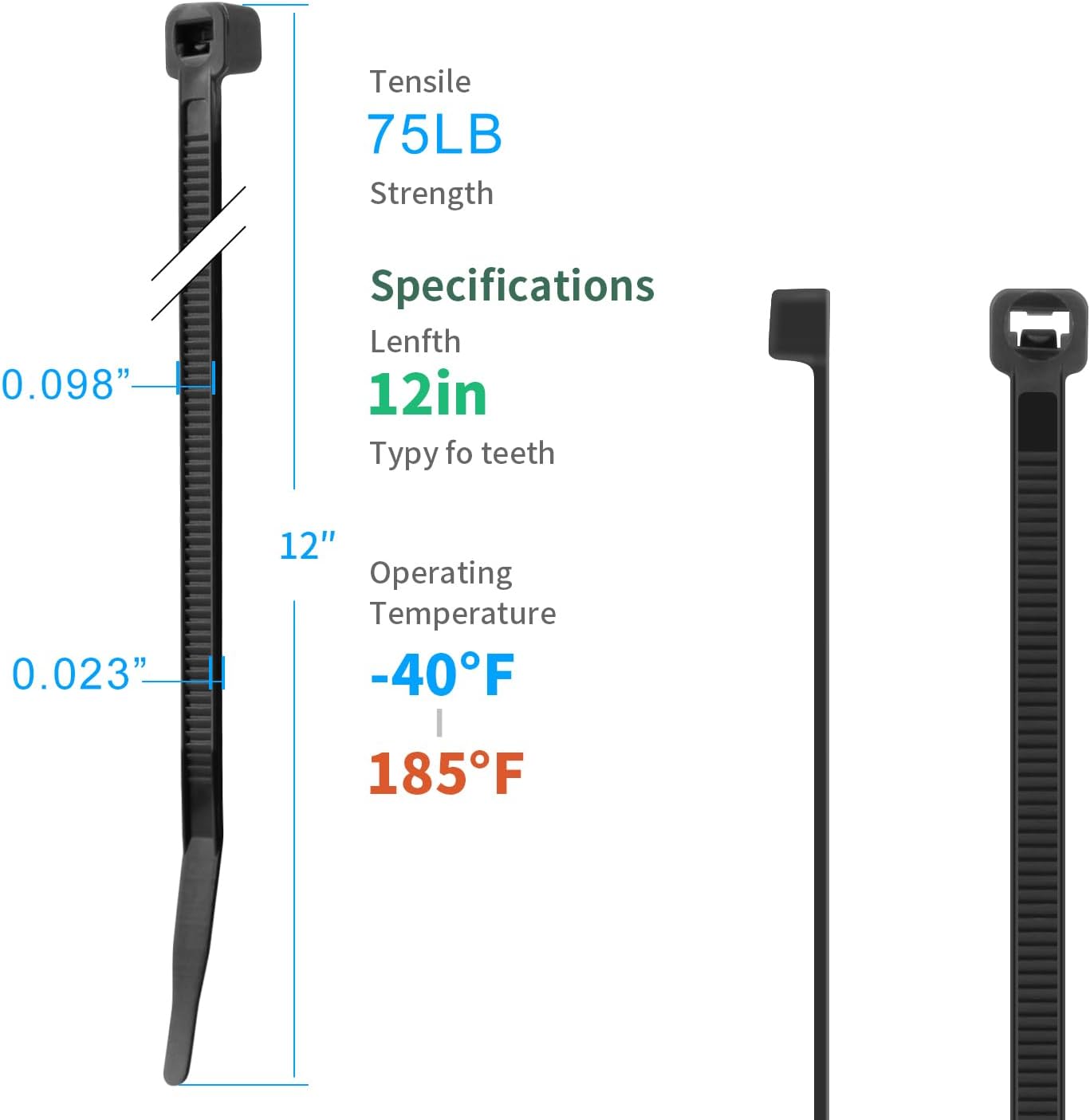 - 【Details】 Dimensions: Length: 12" | Width : 0.19" | Max Dia: 3.2" |Tensile Strength: 75 lbs | With 1200 PCS zip ties, you don't have to worry about running out of in the middle of your project.
