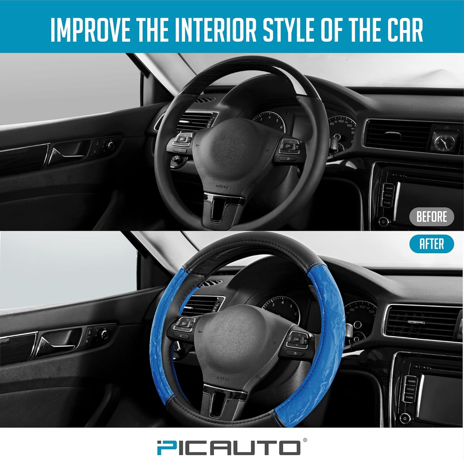 PIC AUTO Steering Wheel Cover, Silk Grain Leather Car Steering Wheel Protector, Comfortable Grip, Universal 14.5-15.5 Inch Anti-Slip Steering Wheels Accessories for Men & Women (Blue)