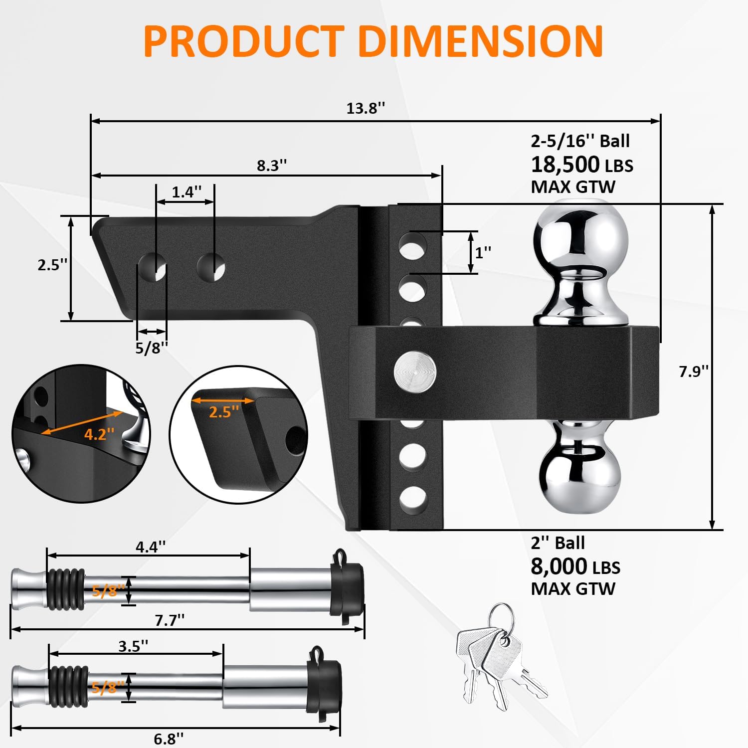 - 【DUAL BALLS, QUICK CHANGE OUT, STRONG PULLIONG FORCE】: Really convenient truck hitch with integrated balls. The 2”hitch ball is with towing capacity of 8000lbs and the 2-5/16” hitch ball are with 18500lbs towing capacity which allows for 6”drop down depth and 6”rise height so the hitch can be easily adjustable for optimal towing. With trailer hitch, you can turn the hitch over without having to change the the balls all the time.No worry about choosing a wrong drop any more.