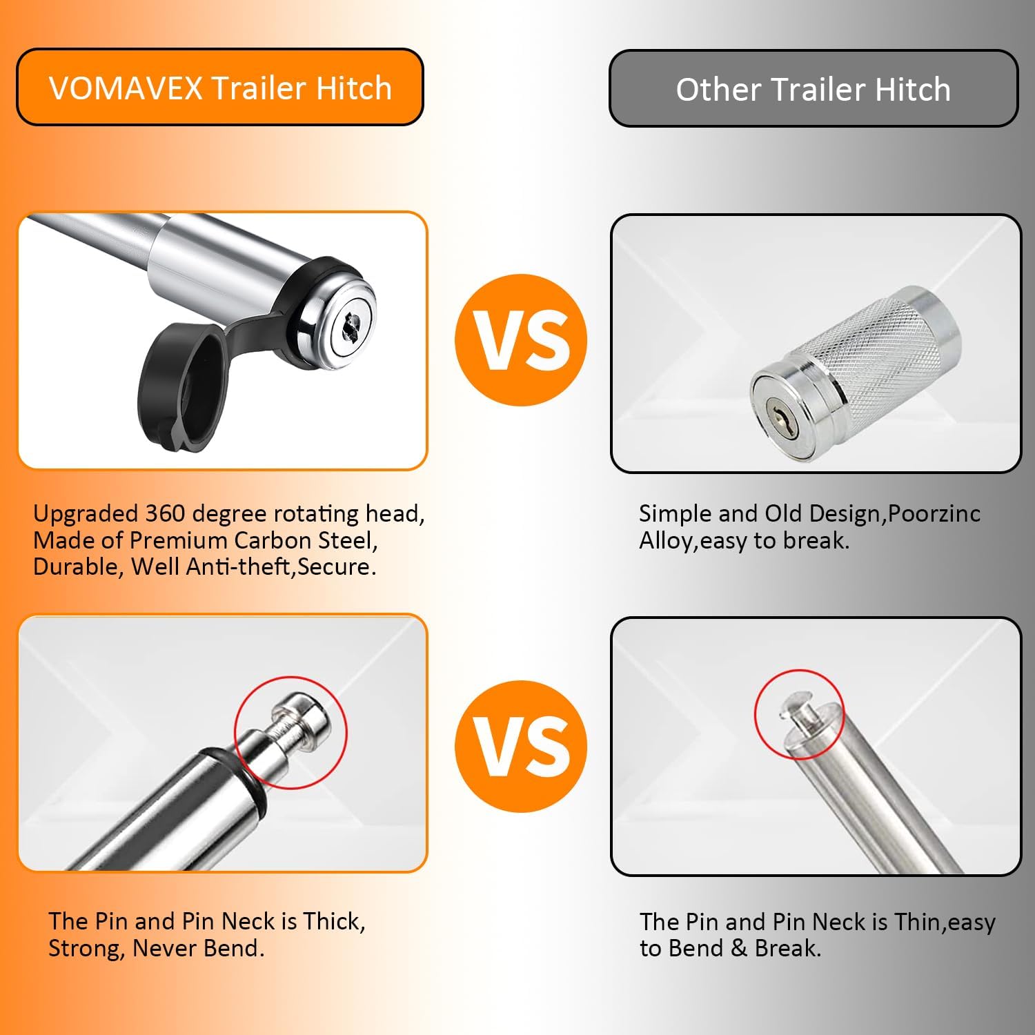 - 【FIRM LOCKING PINS AND COVERS】:Our heavy duty trailers are with 2 firm pins and 2 universal keys. The trailer receiver lock is made with upgraded high-strength steel. So the trailer hitch pin lock can ensure locking safe and protect your trailer and trailer hitch ball mount from theft. The all-weather cover cap of our trailer hitch lock keeps the keyhole away from moisture, dust and rust. Important: Our two locks use the same keys. If you lose one key, it will not make you in hassle.