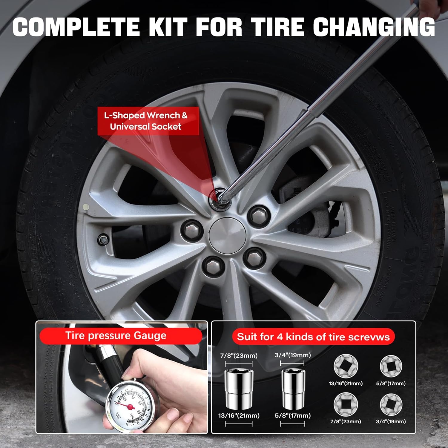 - ăComplete Tire Changing Kită2.5T Scissor jack x 1; Rubber Pad x 2 ; Ratchet Wrenchx 1; Lug Wrench x 1; Pressure Gauge x 1; Storage Bag x 1.he all-inclusive kit fits perfectly in your trunk or garage, ready to tackle any emergency tire replacement job.