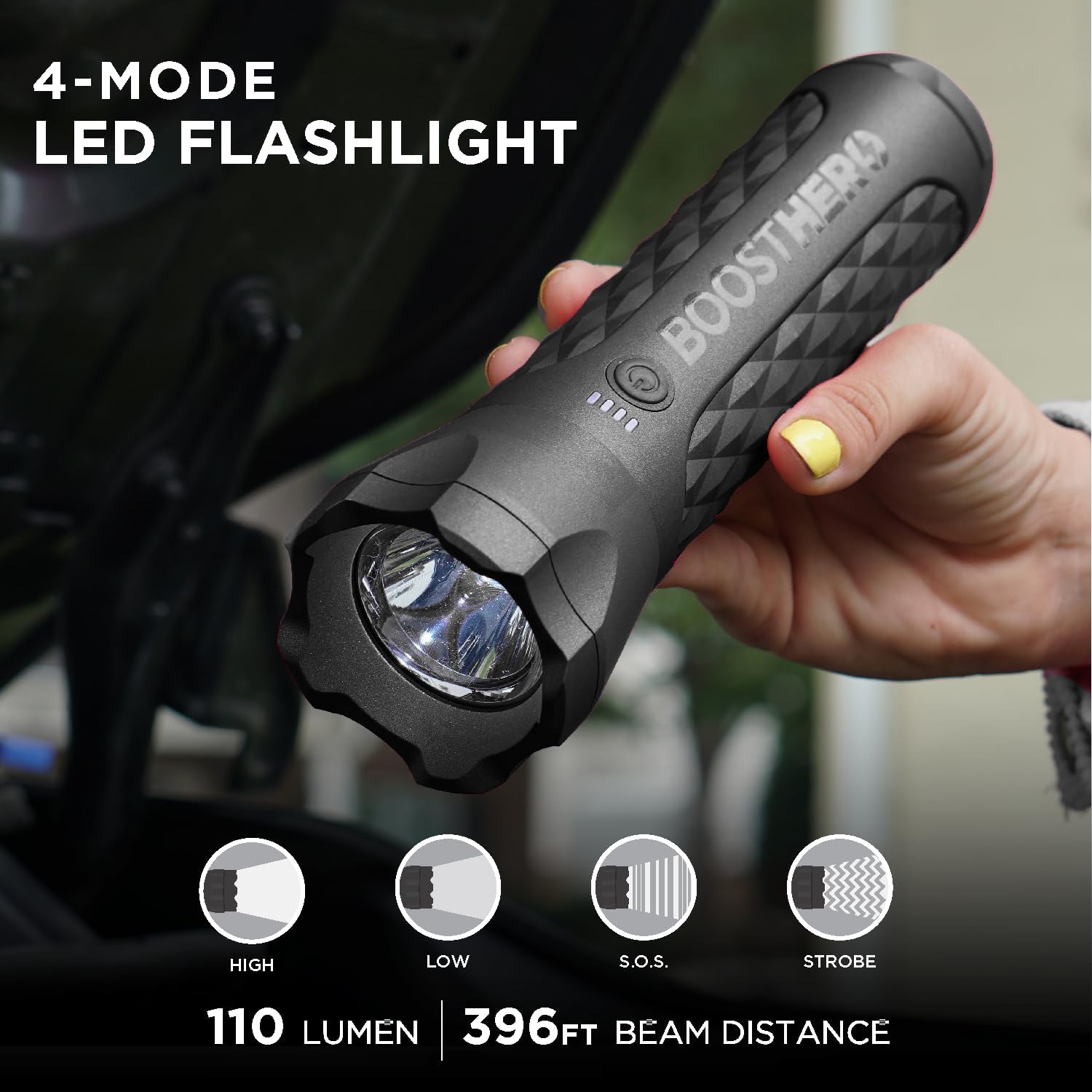 - Universal Jump Starter - The BoostHero is powerful enough to jump start most cars, trucks, SUVโs, boats, motorcycles, lawn mowers, ATVโs, and more! Instantly jump a drained vehicle battery by clamping the Smart Jumper Cables with the patent-pending mini flashlight directly onto the vehicle battery terminals. Powerful 800A peak current to jump-start vehicles with up to 6.0L gas or 4.0L diesel engines.