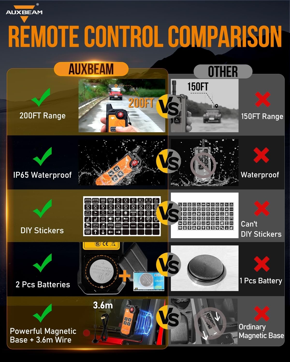 - Upgraded Accessories: AS-400 switch controller upgraded accessories include a circuit box with a built-in solid-state relay, a 60A circuit breaker, fuses, waterproof covers, 60pcs stickers, mounting brackets, and a 10ft wiring harness. Max power: 720~1400W.Temperature range:-40~221ยฐF. 2 years warranty by Auxbeam.