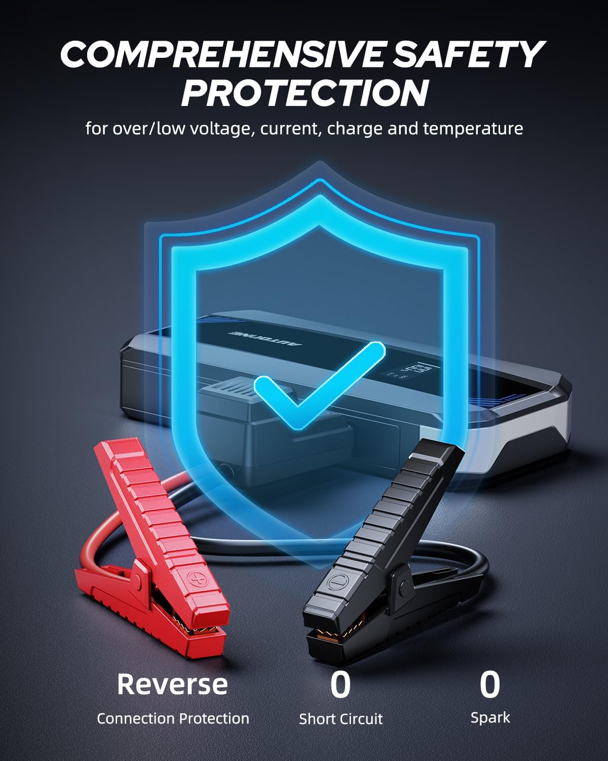 - ăEscort Your Safety while Jump Startă-The portable jump box for car battery is built-in multifunctional safety protection system including spark-proof, reverse polarity, short circuit, high-temperature, overcharge protection, etc. And with smart clamps design, jump pack without worrying about incorrect connections or sparks even if you're a novice. Wide application for 12v vehicles like motorcycles, pickups, RVs, tractors, trucks, vans, ATVs, snowmobiles, yachts, and more