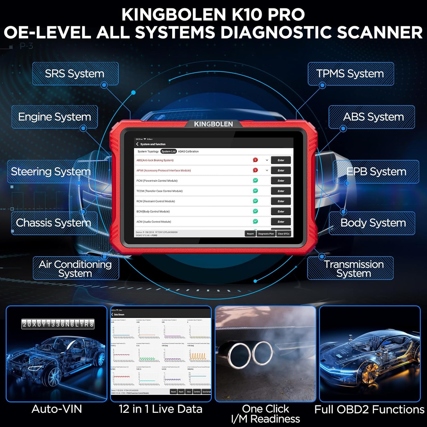 - Newest OBD2 Scanner Bluetooth Diagnostic Tool: The Kingbolen K10 Pro is an upgraded version of the K10 obd2 scanner diagnostic tool, targeted for professional DIYers/mechanics/workshops, with 4+128 GB memory, Bluetooth connection. It features professional functions like topology mapping, ECU coding, VAG guided functions, PMI function, 4K+ active tests, all systems diagnosis, 40+ maintenance, 5 extended modules, CAN FD/DoIP+FCA SGW, diagnostic report QR code share, and more.