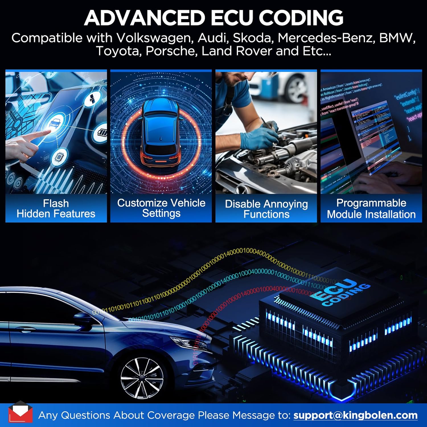 - ECU Coding Diagnostic Scan Tool: The Kingbolen K10 Pro scan tool supports online/ECU coding for vehicles, compatible with VW/SEAT/SKODA/PORSCHE/BENZ/BMW, and more cars added constantly, which helps to match and code after ECU replacement, and personalized car settings including light module, ABS module, and can also unlock hidden functions such as movement pointer and horn alerts when locking/unlocking the car, disable annoying functions like seat warning. Please remember to backup original data before using the function.