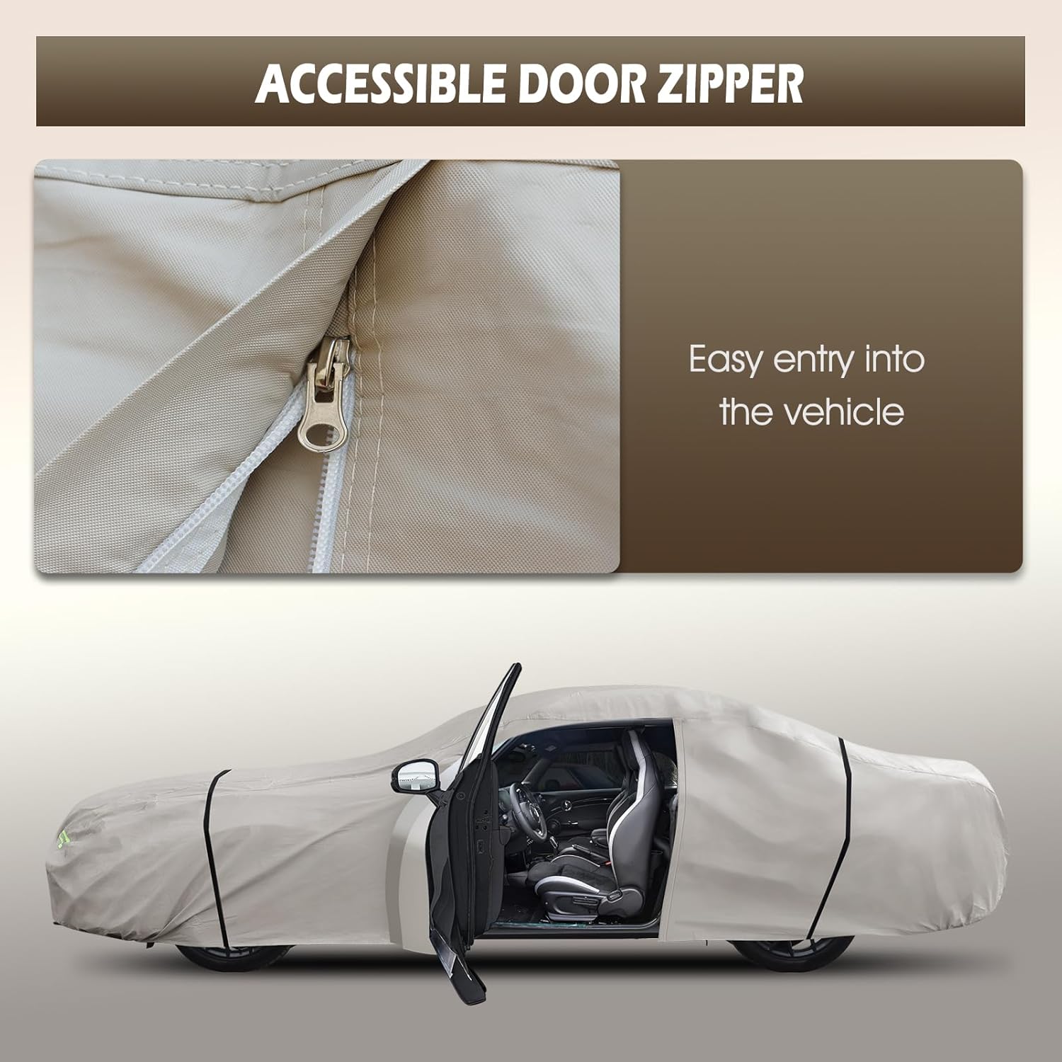 - Safety and Convenience Design: 1)The driver's position of the Migaven full exterior covers has a zipper, which allows you to enter the car at any time to retrieve items without removing the cover. 2) Equipped with six reflective stripes, the full-coverage reflective stripes remind others at night to ensure parking safety. 3) The cover is equipped with a mirror pocket to protect your mirrors perfectly and avoid damage. 4) It comes with a storage bag for easy placement.