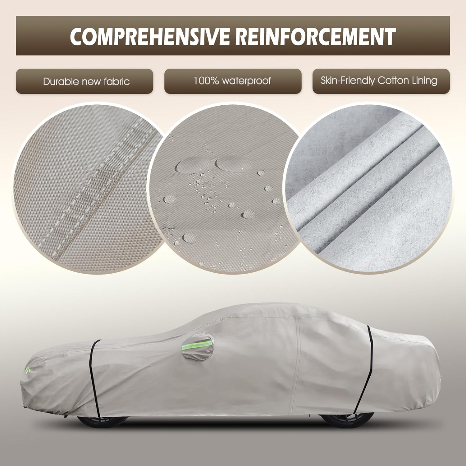 - High-Quality Material: Migaven car cover features a multi-layer composite material design. Layer 1 is PA coating, providing 100% waterproofing. Layers 2 consist of PE, enhancing breathability and maintaining suitable interior temperatures. Layer 3 is an aluminum membrane that reflects 99% of UV rays, reducing UV damage. Layers 4-5 are PEVA material, with strong tear resistance to maintain integrity in harsh weather. Layer 6 is soft cotton, effectively safeguarding the car's paint.