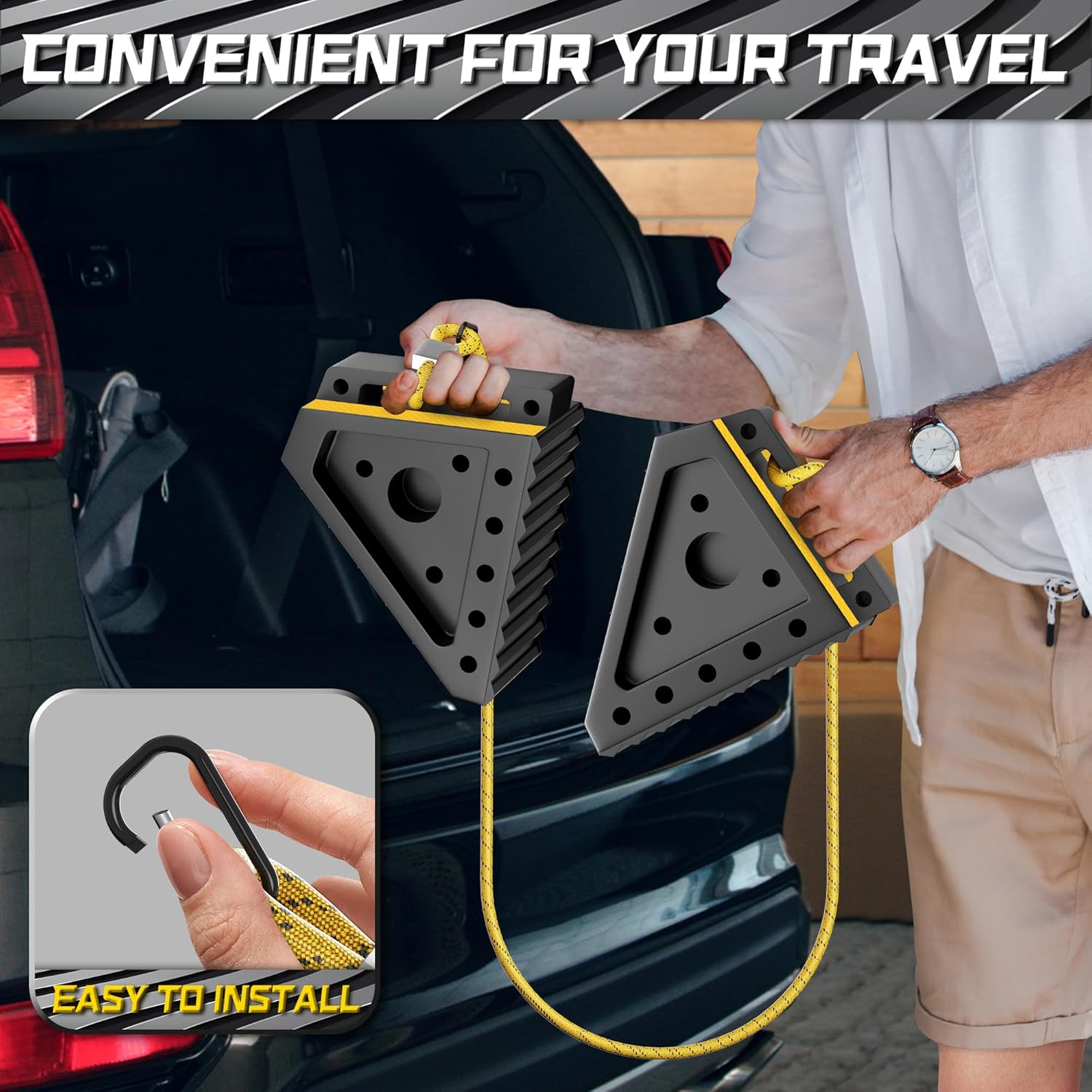 - WARNING REFLECTIVE STRIP: Each wheel chock is designed with two yellow reflective strips for increased visibility and provides the warning function when the vehicles are parked. It can effectively remind drivers to avoid collisions and keep your vehicle safe.