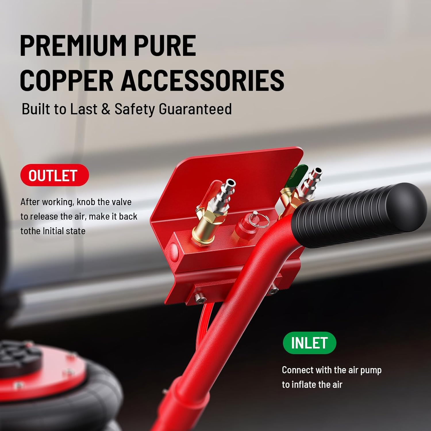 - Upgraded Stability Design: The air jack features six reinforced steel pipes, optimized for height and structure. This design ensures exceptional stability when lifting heavy vehicles.