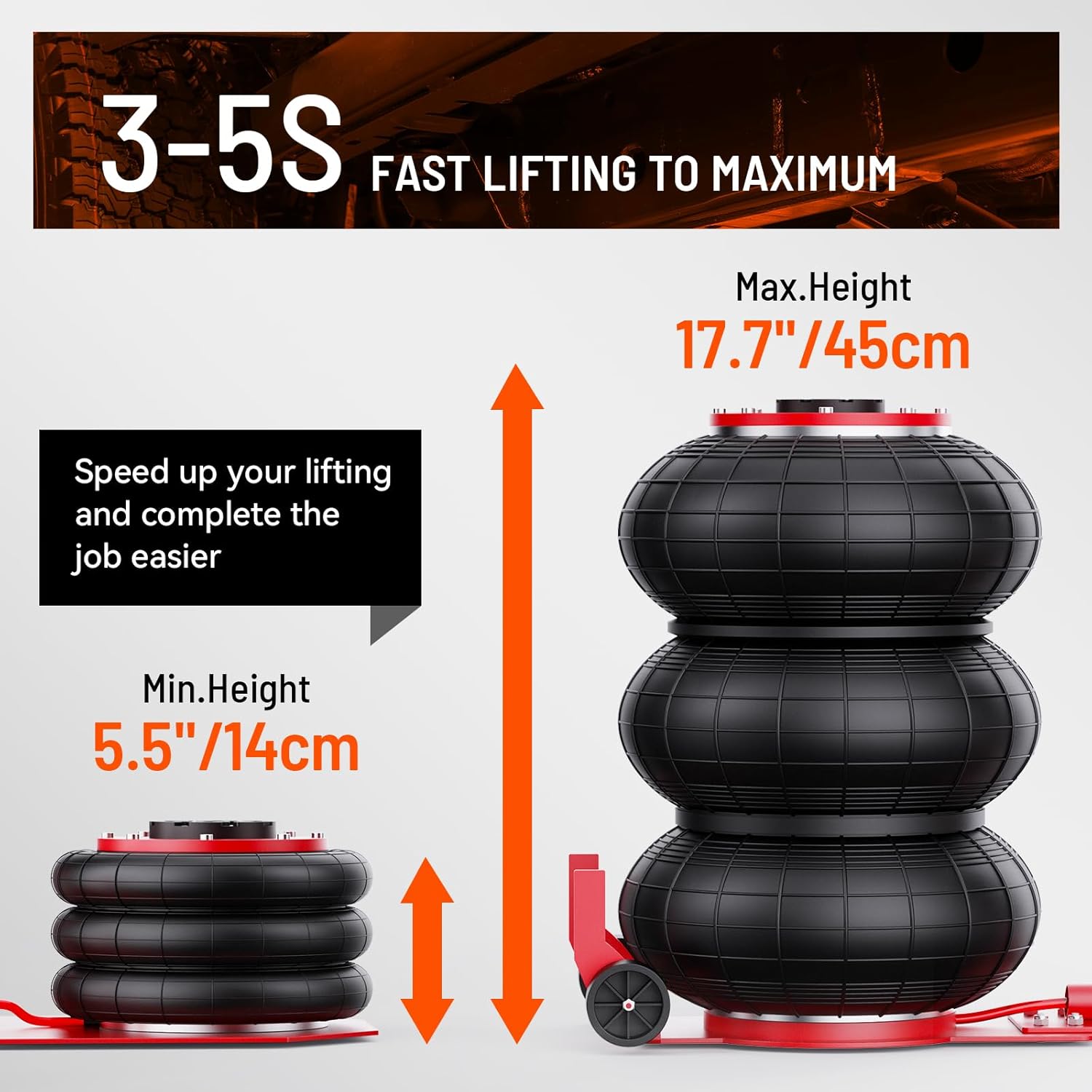 - Quick Lifting: Simply connect to an air compressor, and with a push of the valve, lift your vehicle in just 3-5 seconds. Fast, effortless, and time-saving—perfect for quick maintenance or repairs.