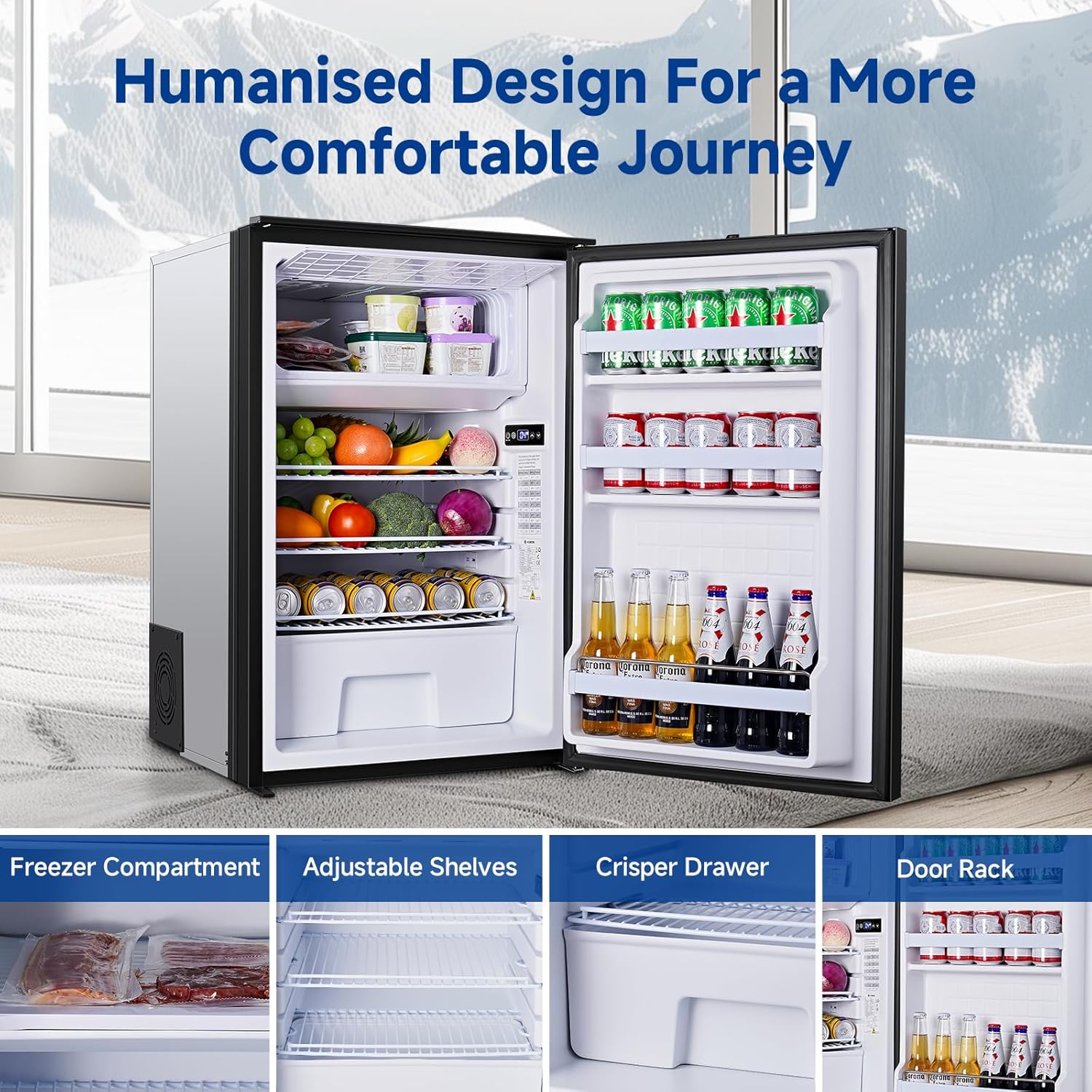 - User Friendly Design: This Portable Fridge Freezer is equipped with a removable crisper drawer, shelf and bottle holder, plastic shelf adjusts between two positions to accommodate items of all shapes and sizes. Convenient interior light for easy access in the dark.