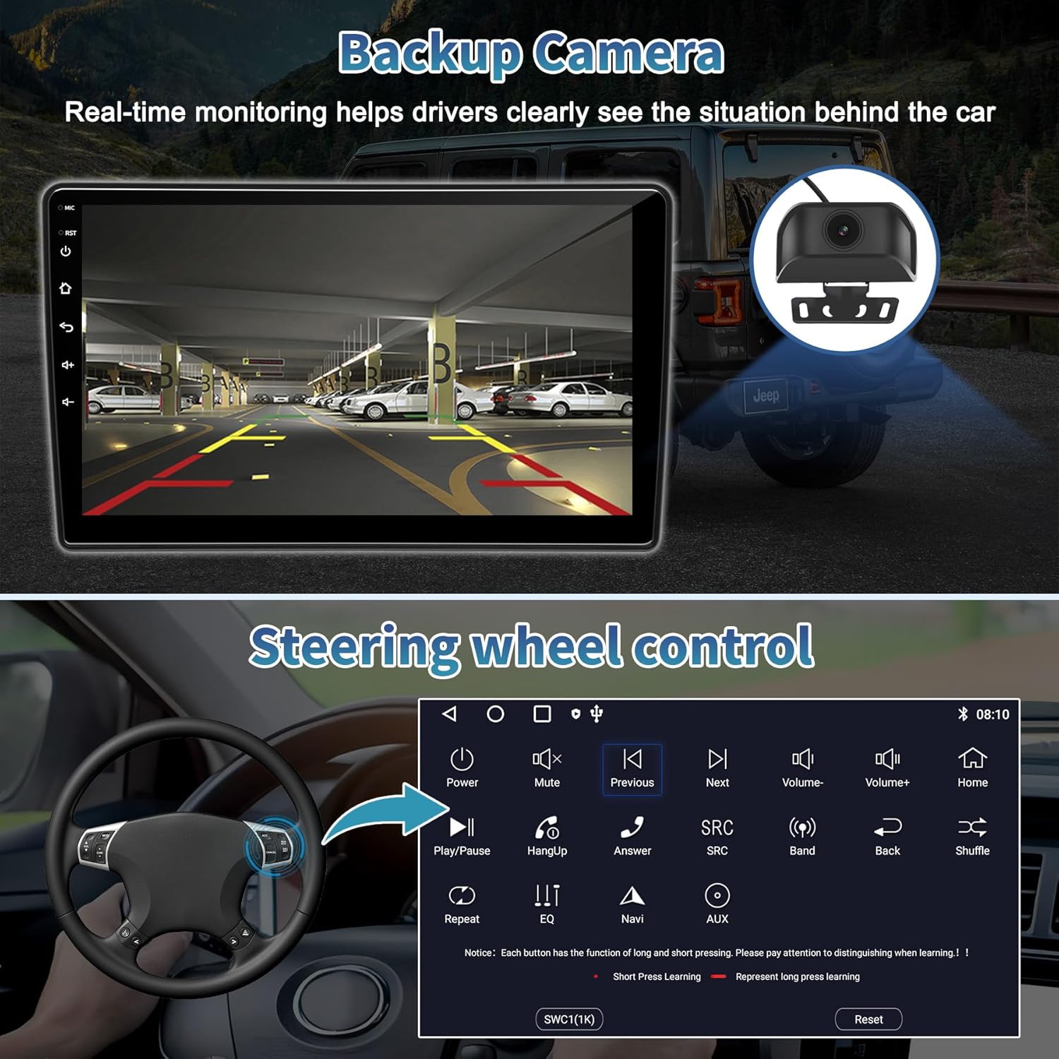 - Backup Camera: The car stereo for Jeep Patriot Dodge Ram Includes a 1080P waterproof backup camera with a 170-degree wide-angle view. The reverse guidelines will automatically appear when you shift into reverse