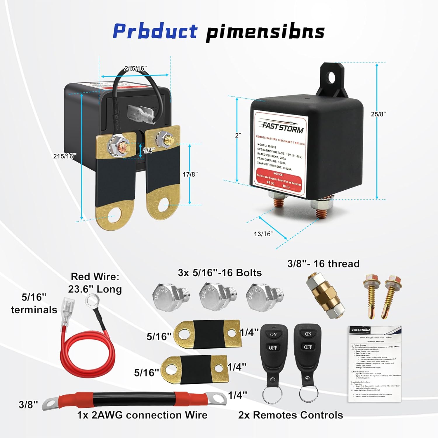 - ăComplete Kit for Effortless Setupă This 12V battery disconnect switch delivers one-tool installation with a step-by-step guide and visual wiring diagram. The kit includes everything you need: 1/4"Relay Switch with Wire Harness, 2 Remotes, 1 3/8"Side Post Adapter, 1 Connection Wire 2AWG, 2 5/16"Copper Bars, and 3 Bolt 5/16" Thread. The red/black wires attach to battery positive/negative poles, while the relayâs stud terminals link the batteryâs negative post to your vehicleâs ground wire