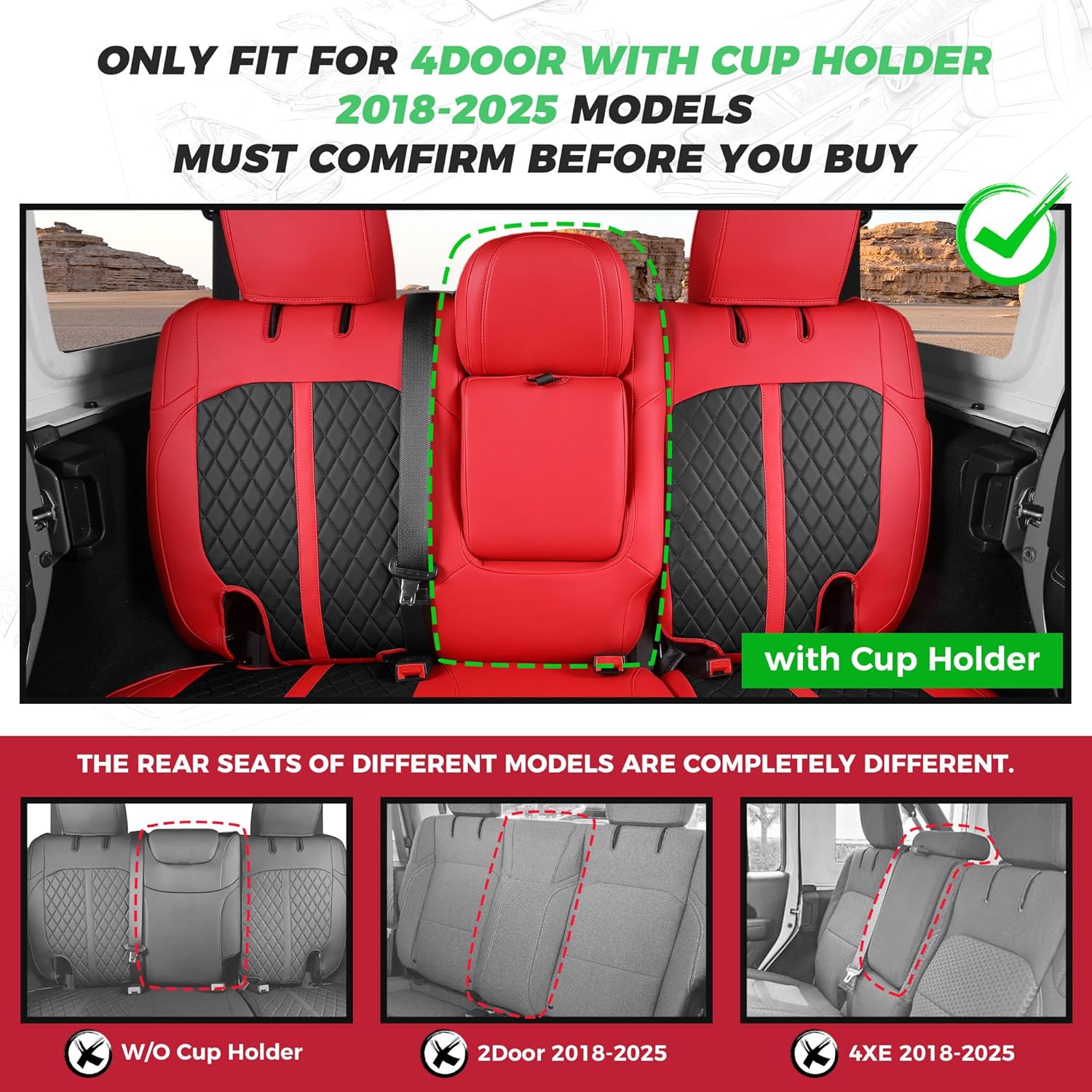 for Jeep Wrangler Seat Covers 4Door JL 2018 2019 2020 2021 2022 2023 2024 2025, Custom Fit Car Seat Cover Full Set, Luxury Waterproof Leather Seat Protectors, Red Black, with Rear Cup Holder