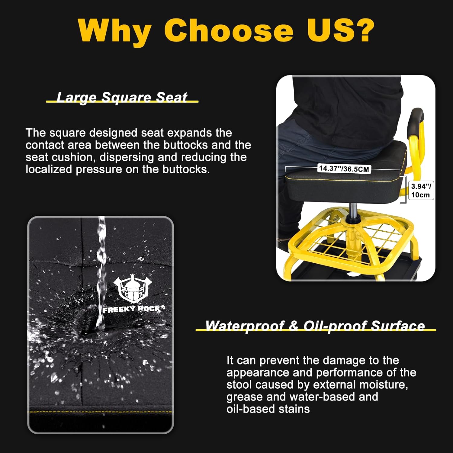 - ăThickened Seat Cushionă14.37"/36.5CM Diameter Seat. 3.94"/10 CM height cushion. The thickened memory foam padded cushion seat is larger than other garage work stools. The cushion surface of stool is made of PVC material which is waterproof and oilproof, making it easy to be cleaned