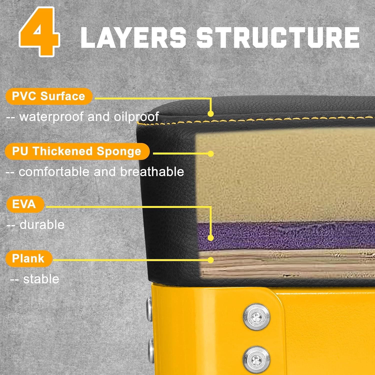 - Comfortable 4 Layers Structure Padded Seat : The Mechanic roller seat cushion is consists of 4 layers structure. The 1st layer is a solid wooden plank, the 2nd layer is a durable EVA, the 3rd layer is a comfortable and breathable PU thickened sponge, and the 4th layer is a waterproof and oilproof PVC surface. Plump and Soft Touch, Awsome Support, and Very Comfortable.