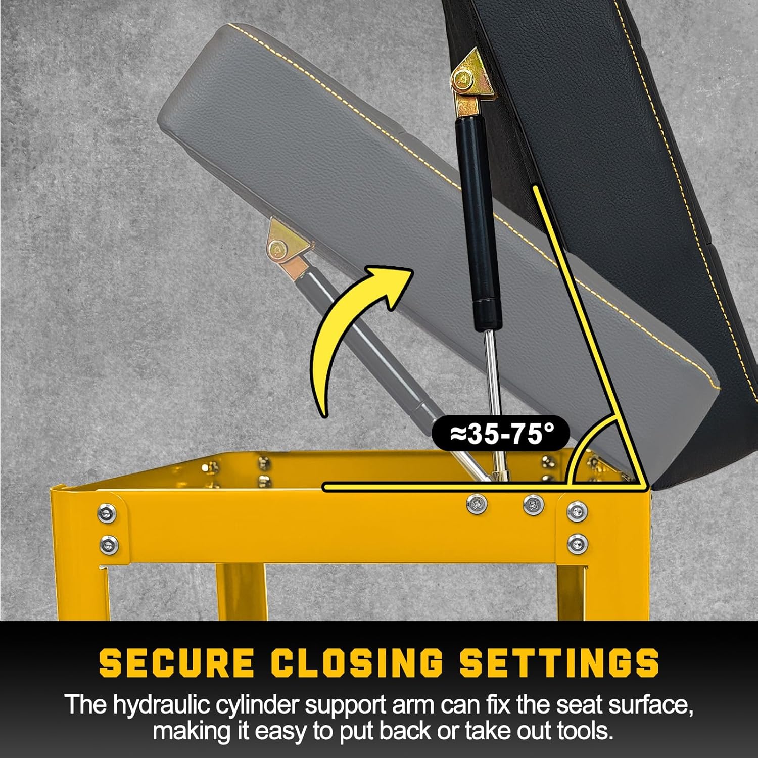 - Extra Large Tool Tray Storages: The mechanic stool chair has 2 large Tool Tray Storages. The bottom layer is obvious three-compartment chassis that separates the tool area from the small parts area. The storage space located under the seat cushion can hold many tools such as hammers, wrenches, tape measure, ect. Very suitable for motorcycle and car maintenance work, this is the best mechanic stool for mechanics.