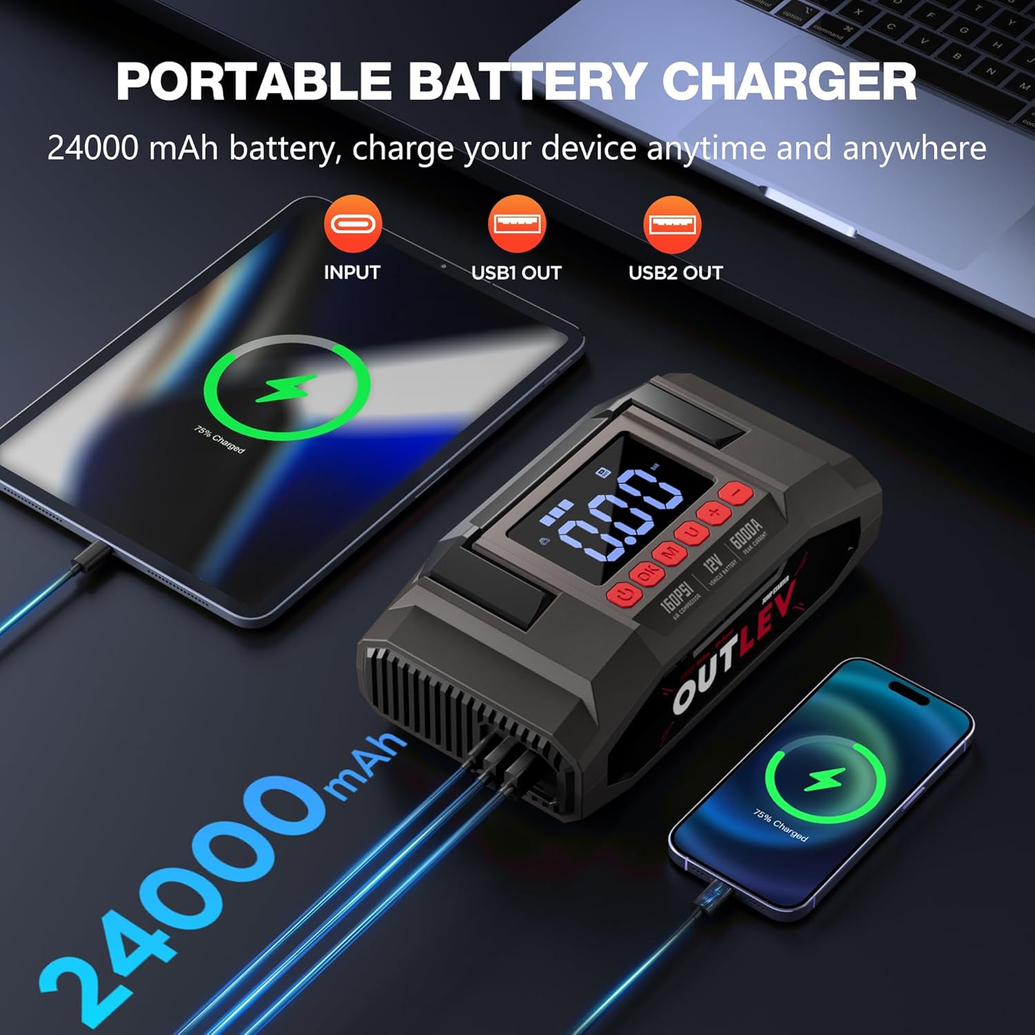 - ADVANCED SAFETY & DURABLE DESIGN (10-LAYER PROTECTION): Jump starter with total confidence. OUTLEV safeguards prevent sparking, reverse polarity, over-current, over-voltage, short-circuit and more. Heavy-duty smart clamps and honeycomb thermal management reduce heat by 30%, extending lifespan and ensuring safety.