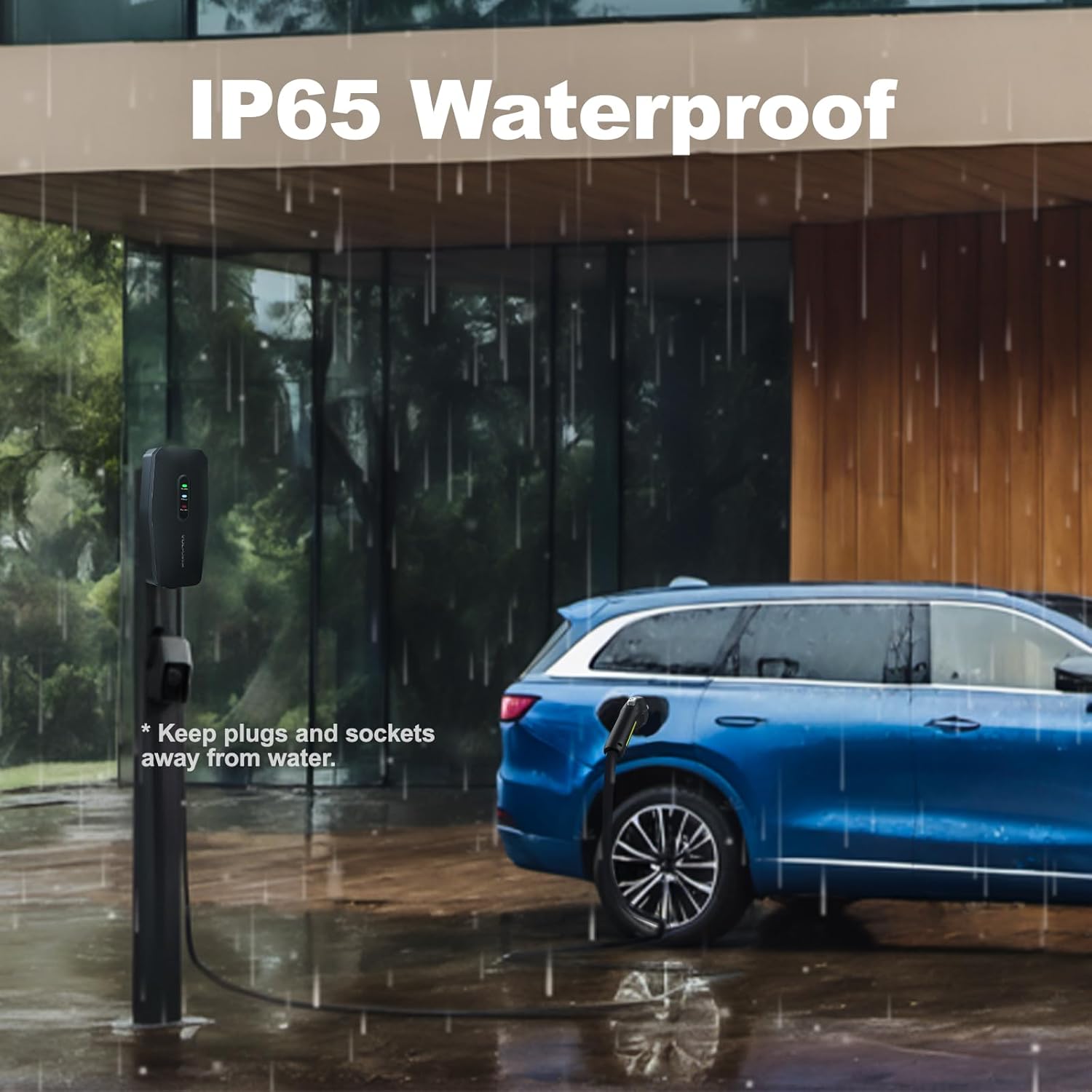 - 【Intelligent Charging-Durable and Safe】The intelligent chip design of its control box can keep monitoring the charging status at any time, provides multiple safety protections such as lightning protection and leakage protection. This electric vehicle charger is made of premuim and sturdy materials and is FCC certified. EV Control box is IP65 waterproof and dustproof.