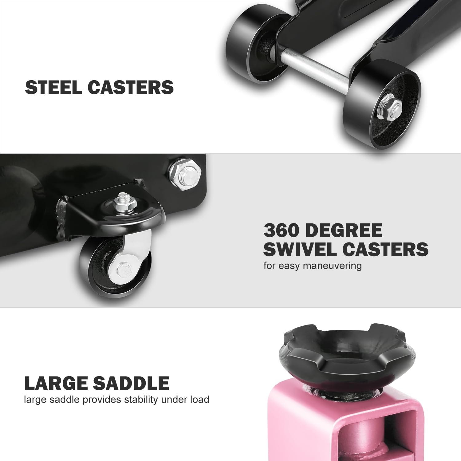 - OVERLOAD PROTECTION & EASY JACK POSITIONING: Built-in dependable safety release valve triggers in the event of an overload to prevent damage or injury. The large saddle equipped with rubber pad provides extra stability and helps protect your vehicle.