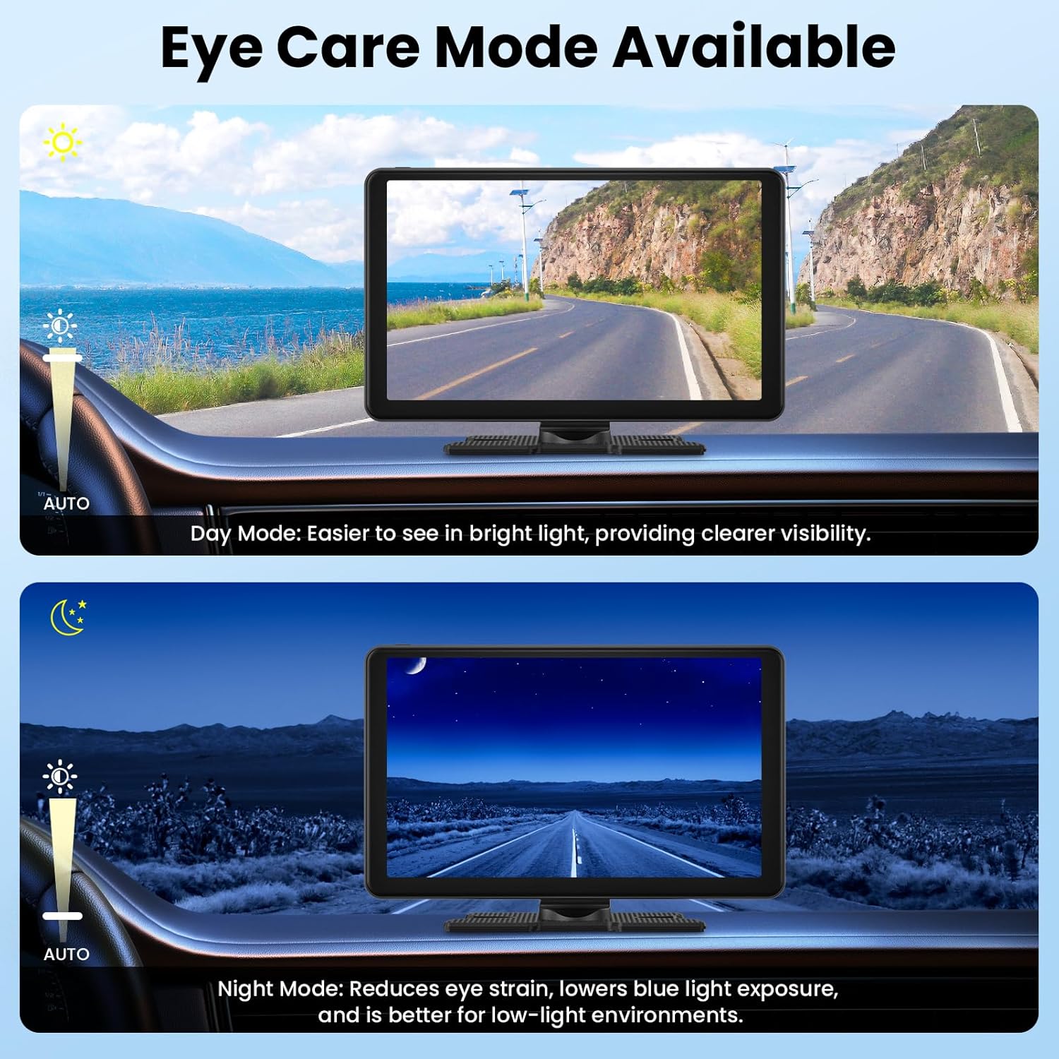 - 【Wireless Carplay and Android Auto】 9 Inch Portable carplay screen for car supports Wireless Carplay & Android Auto. You can access your phone's music, map navigation, messages, hands-free Phone Call etc. when it simply connects to your smartphone via Bluetooth and WiFi or USB. You can even connect your device's Google or Siri assistant to control phone calls, navigate, play music, all so you can focus on the road, keep your hands free, and drive in complete safety!