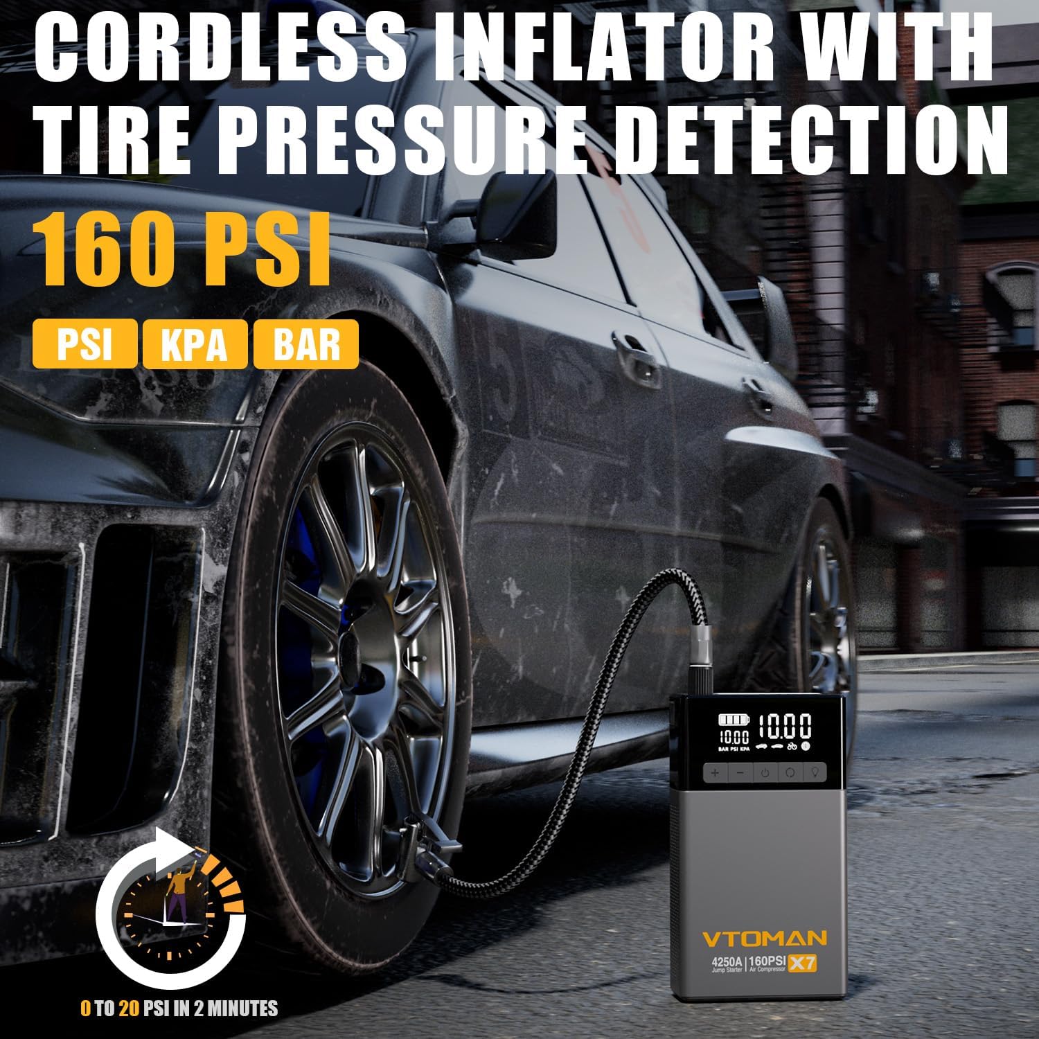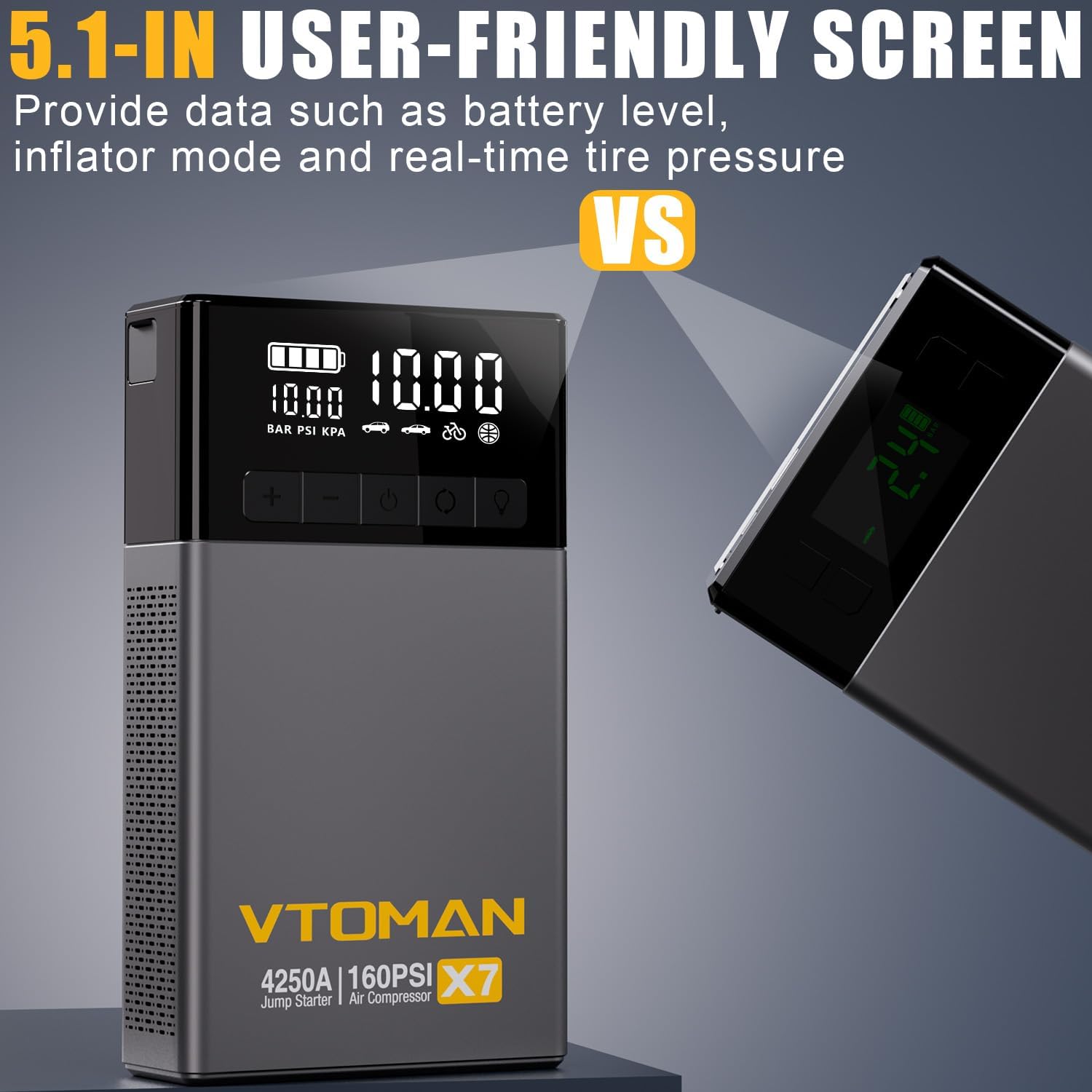 VTOMAN X7 Jump Starter with Air Compressor, 4250A Portable Car Starter (Up 10L Gas/10L Diesel Engine) with 160PSI Digital Tire Inflator,12V Lithium Battery Charger Booster Box with Jumper Cables