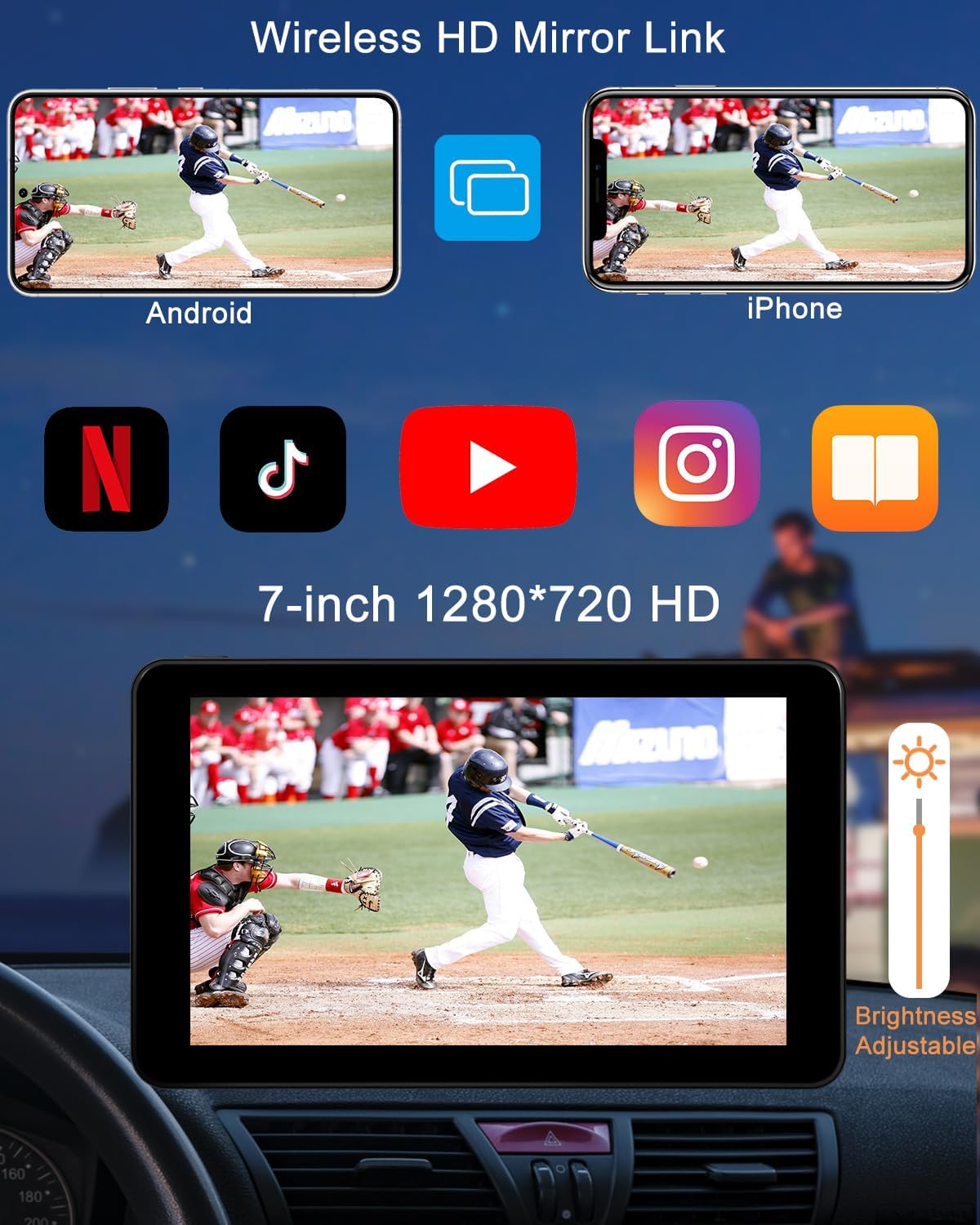 Compatible Wireless Apple CarPlay Android Auto Car Screen, 720P Back Camera 7″ Touch Screen Car Music Video Player Portable GPS Naivgation Bluetooth Mirror Link, Siri, AirPlay, Voice Assistant