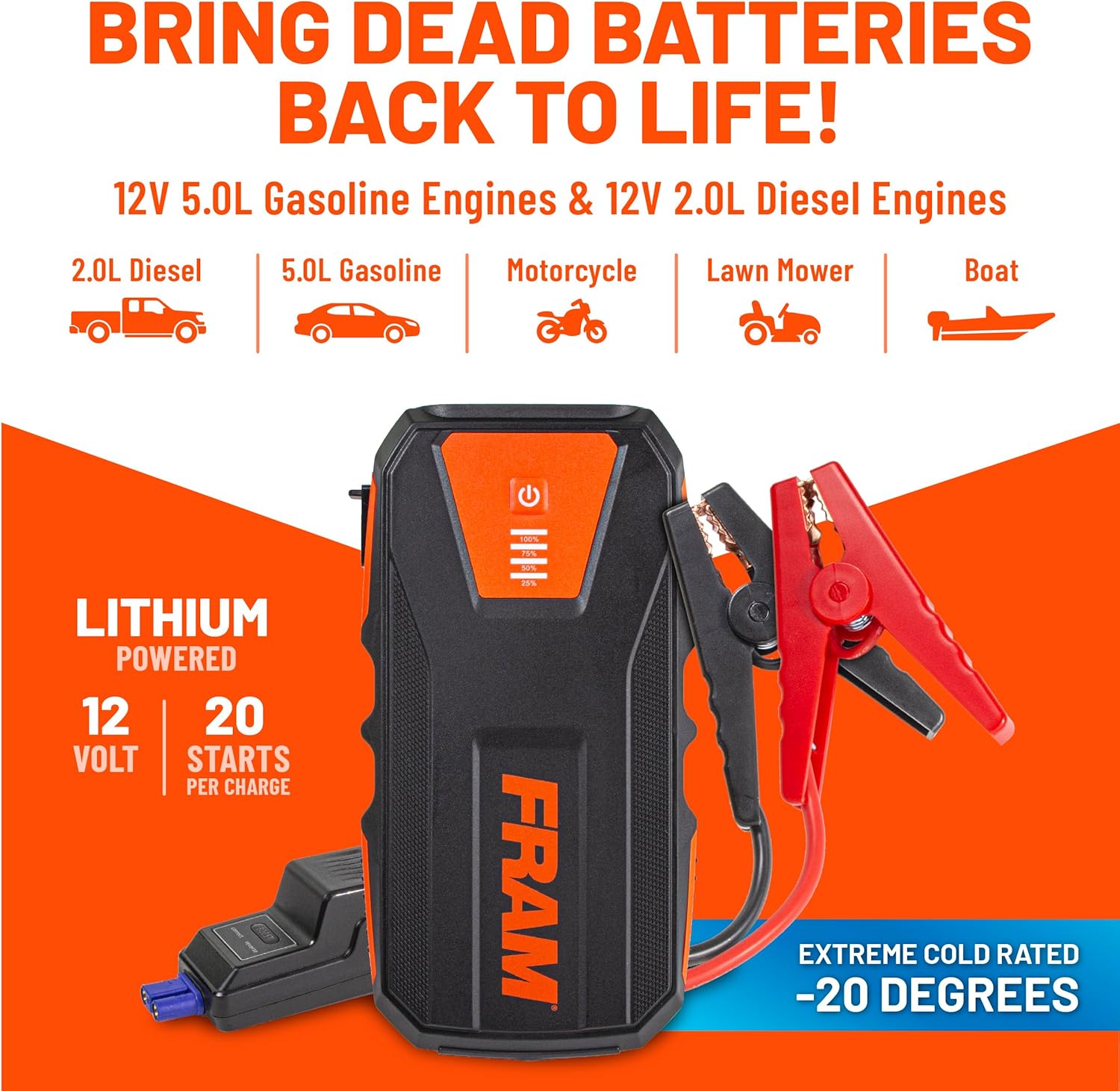 - PORTABLE CAR BATTERY CHARGER: The FRAM Jump Starter expertly designed, high-performance jump starter with 12000 Milli Amp-Hour capacity. The car accessory is capable of jump-starting gas engines up to 5.0L and diesel engines up to 2.0L, providing coverage for all common vehicles on the road.