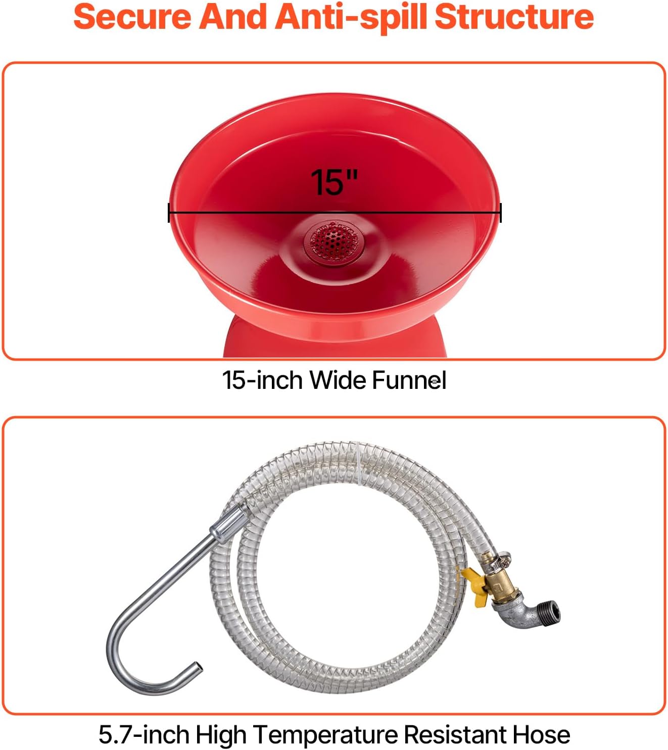 - Anti-leakage Design: Equipped with a 15-inch ultra-wide splash-proof funnel, the oil recovery efficiency is improved simultaneously. Equipped with a 5ft and 9inch high-temperature resistant reinforced oil pipe (withstands 120Β°C continuous working temperature), it effectively prevents overflow and leakage, ensuring security and reducing the cleaning burden