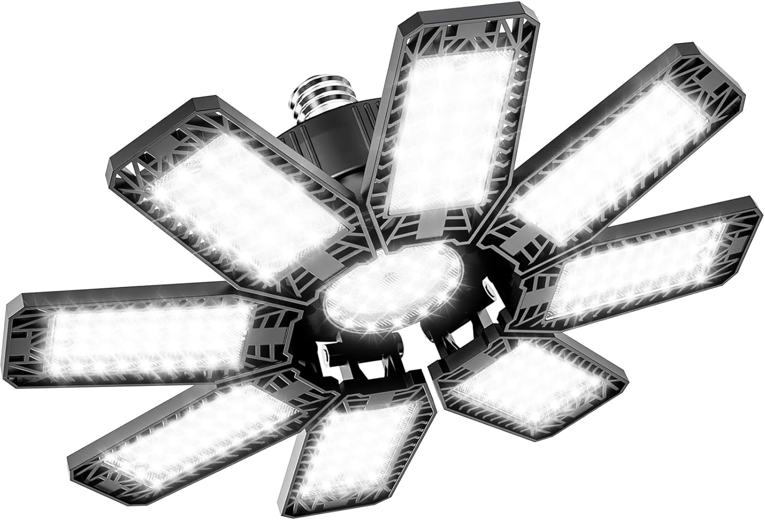 - Adjustable Beam: LED garage light can be folded 8 panels + 1 central panel design, supports 0-90Β° angle adjustment, and achieves 360Β° full-angle lighting. This is exactly what you are looking for to solve the uneven lighting of traditional 3-6 blade garage lights