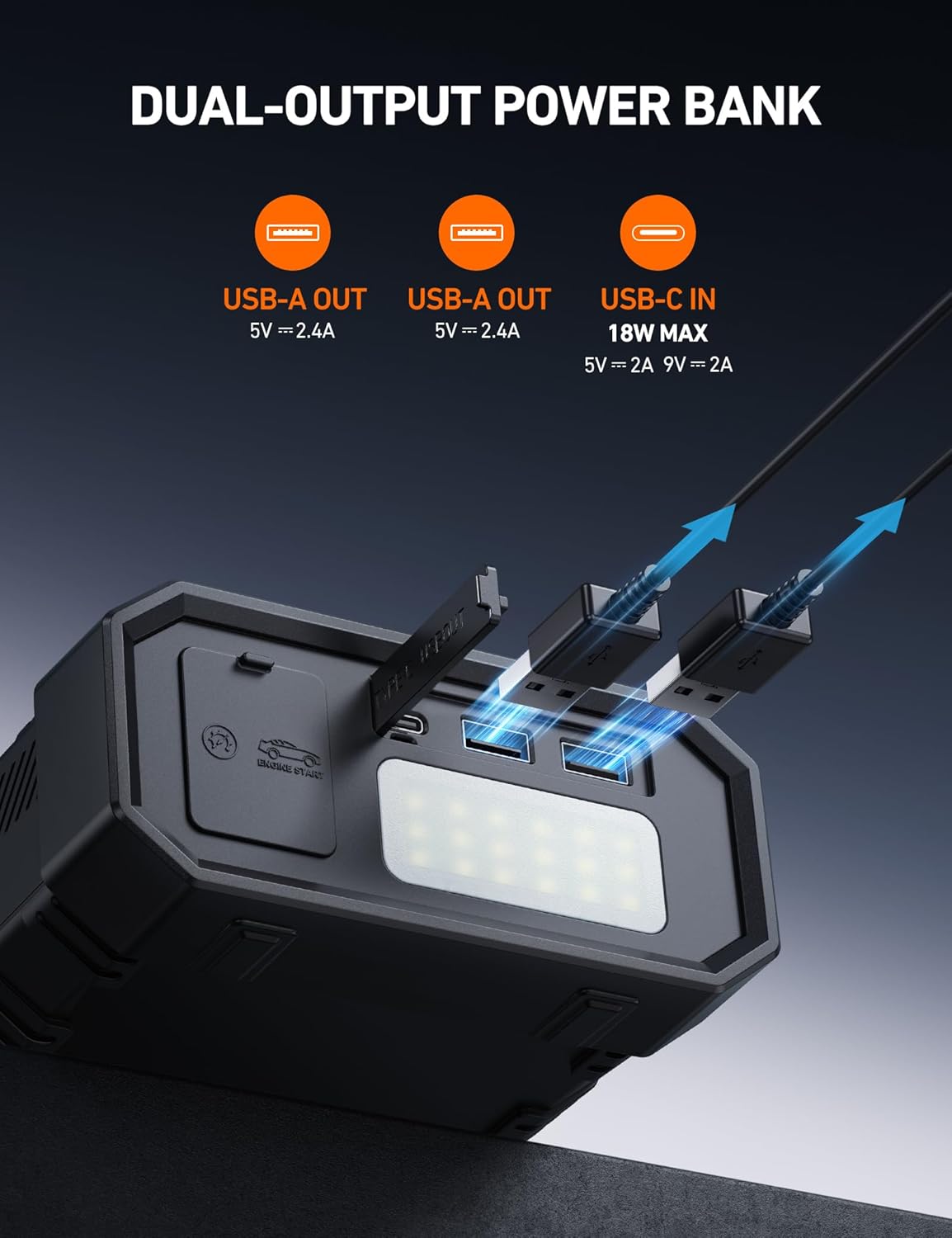 - ăPOWER BANK & FLASHLIGHTăThe A30 serves as a portable power bank, featuring 2 USB-C output ports to charge multiple devices simultaneously. With an 18W maximum input, the unit itself can be fully recharged in just 2-3 hours. The 400-lumen LED flashlight is 3 to 5 times brighter than standard devices and includes SOS, strobe, and normal flashlight modes, making it an indispensable tool for roadside emergencies.