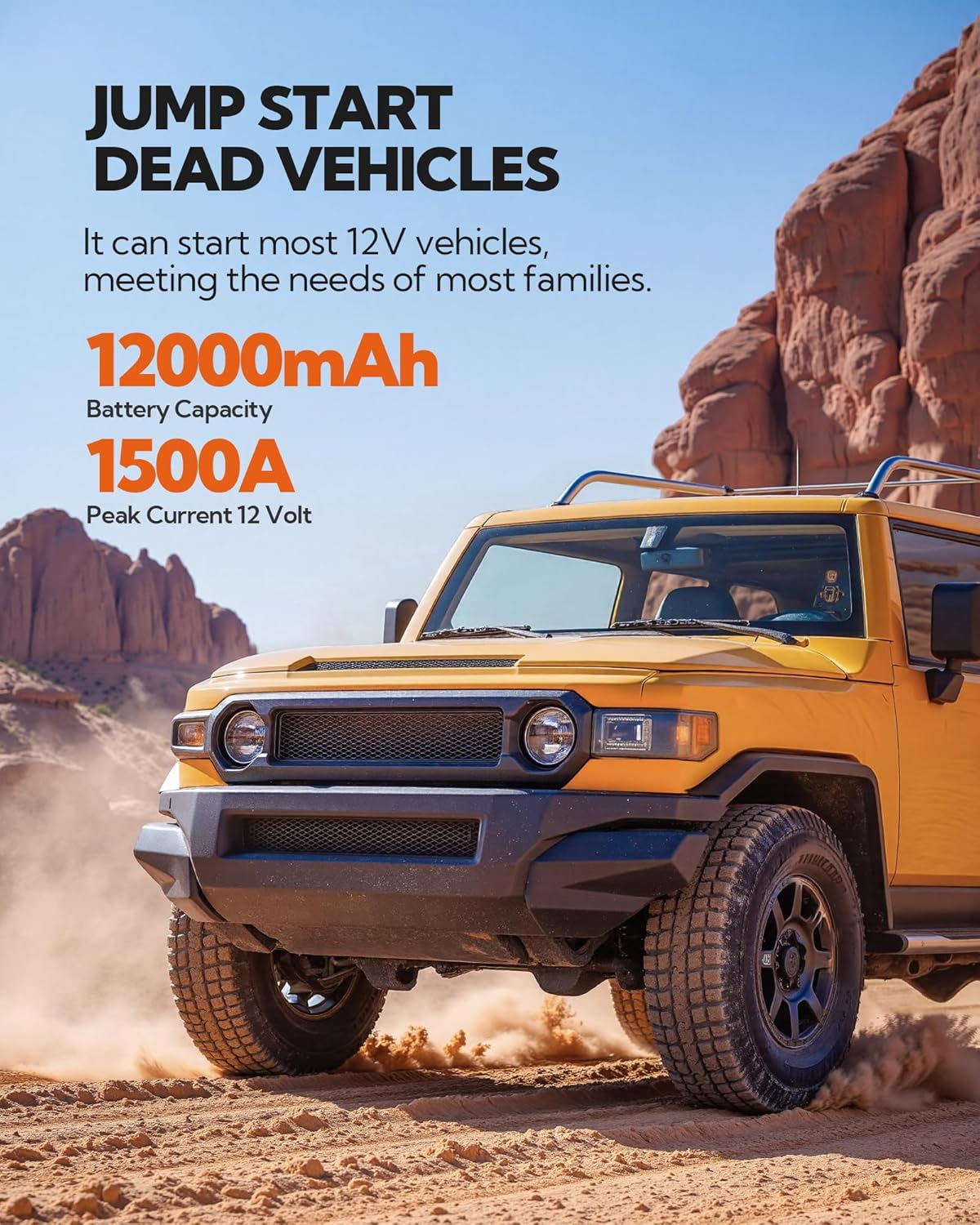 - Ture Inside :With a powerful 12000mAh(Real 3*4000mAh 14.8V) battery, this jump starter is perfect for 12V vehicles like sedans, pickups, motorcycles, and some lawn mowers. It quickly restores your vehicle's power in emergencies。The jumper cables also have a built-in smart chip and a foolproof design to prevent short circuits. If your battery is completely dead, there is a forced start button that you can use (for details, please refer to the instructions).