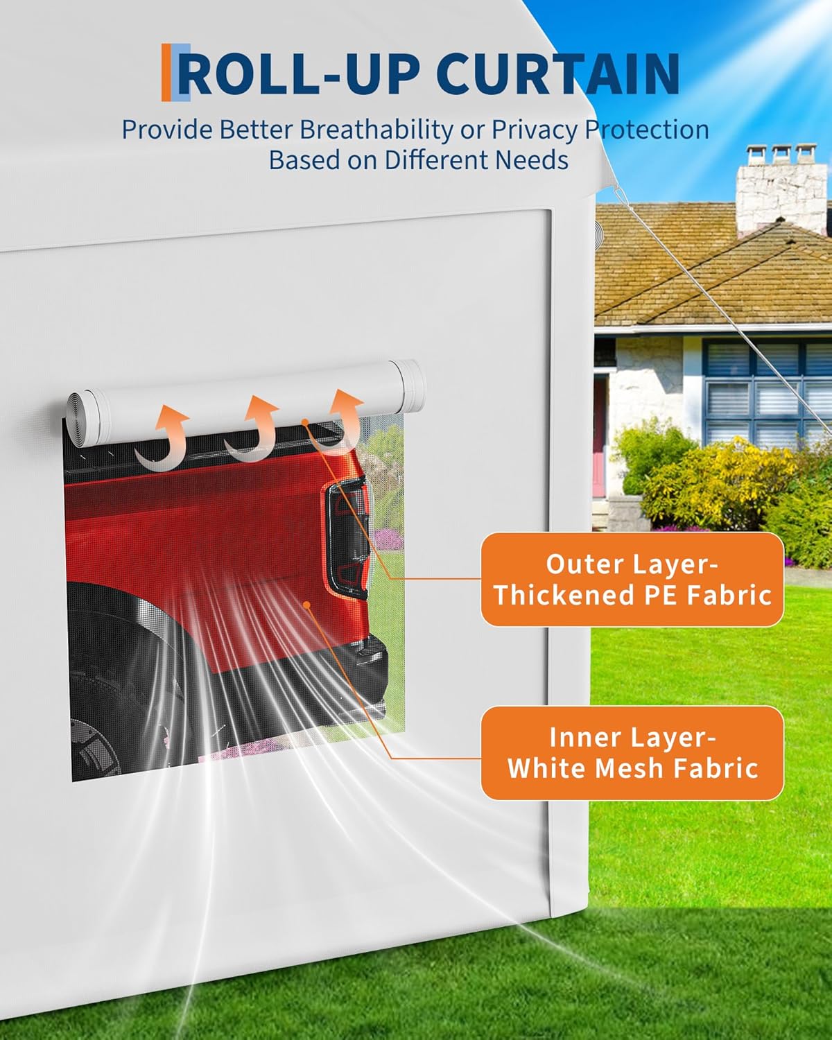 - [Optimized Climate Control] Four zippered roll-up doors and four mesh ventilation windows allow 360Β° air circulation and prevent condensation build-up. Breathable car awnings are designed to protect the vehicle from temperature fluctuations while minimizing interior space - essential for preventing rust on classic cars or machinery. Removable side panels can be customized for the season.