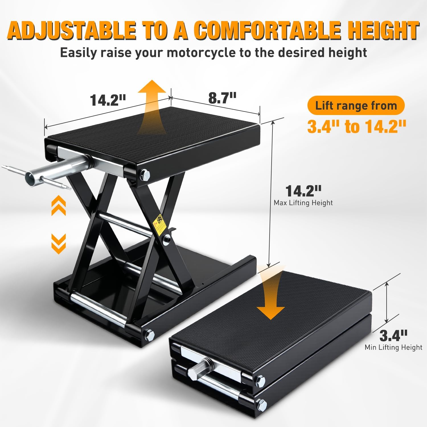 - EASY TO OPERATE: Lift adjustable height ranges from 3.4 inch to 14.2 inch. With no additional tools required, motorcycle scissor lift can be easily lifted and lowered by turning the included removable crank handle to raise the bike or motorcycle to the desired height for maintenance, repair or storage. Do not use an impact wrench or powered drill to operate the lift