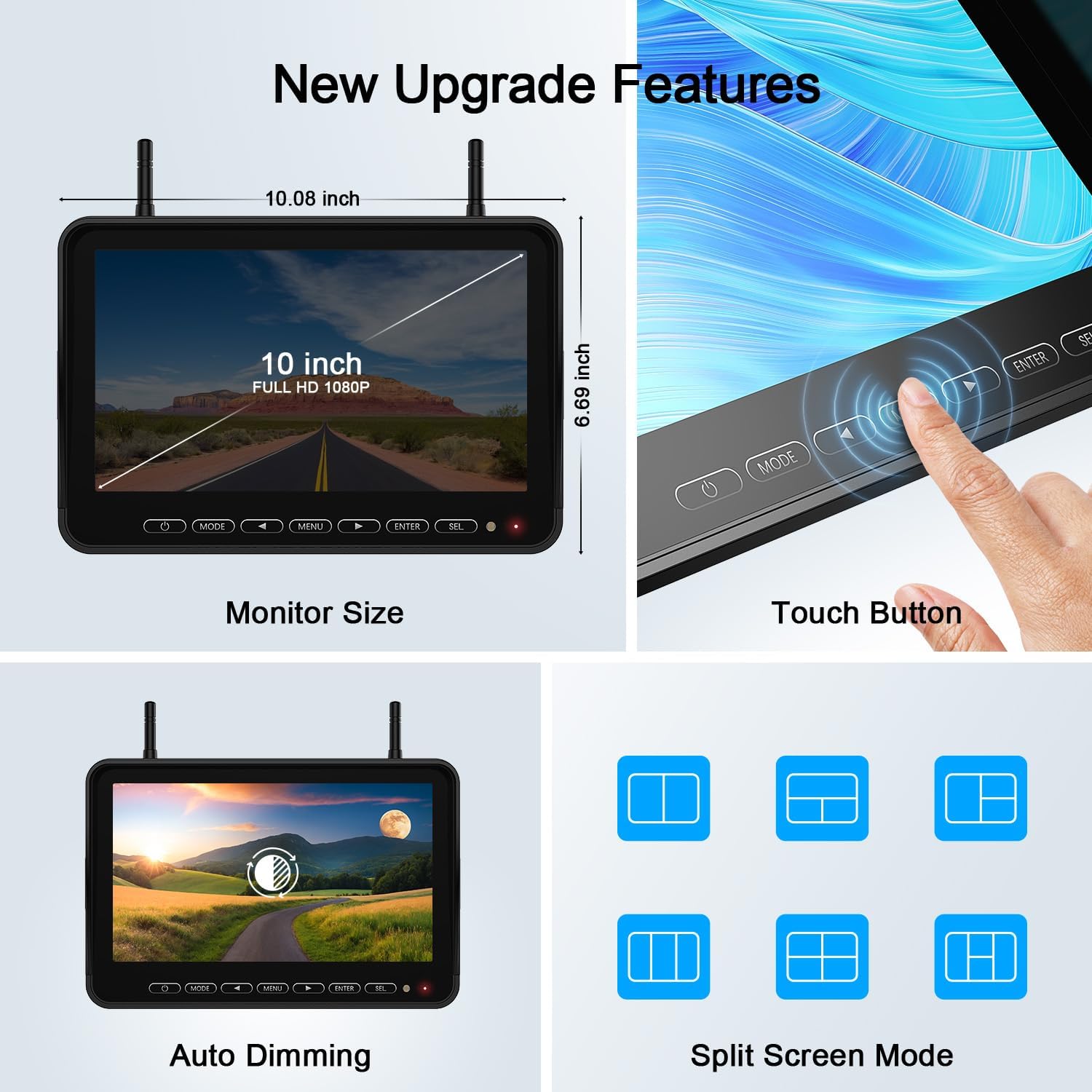 - Quad Split Screen & Full HD Stunning Visuals: 10" IPS monitor provides with crisp images and parking lines. Equipped with touch buttons, a touch of the response, faster and more convenient operation. With auto-dimming, screen will automatically adjust the right brightness, night driving will not be affected. It can support up to 4 cameras for full coverage and display in dual/triple/quad split screen mode.