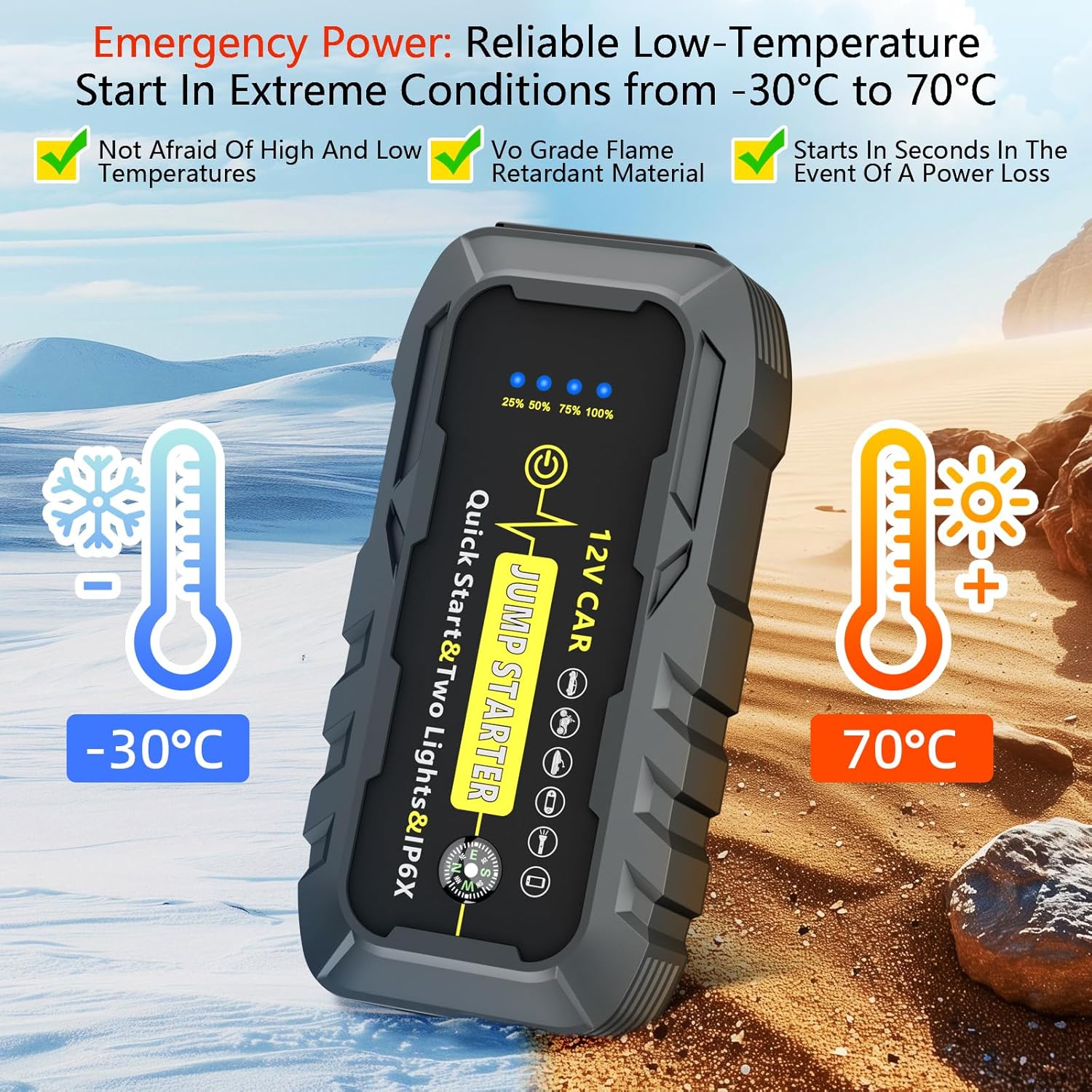 - POWERFUL JUMP STARTER:-The A5 Car Battery Jump Starter delivers a peak current of 3000A, making jump-starting most 12V car models easy. It takes just 1–2 hours to fully charge and can provide up to 50 jump-starts on a single charge, so you'll always be ready for unexpected battery issues