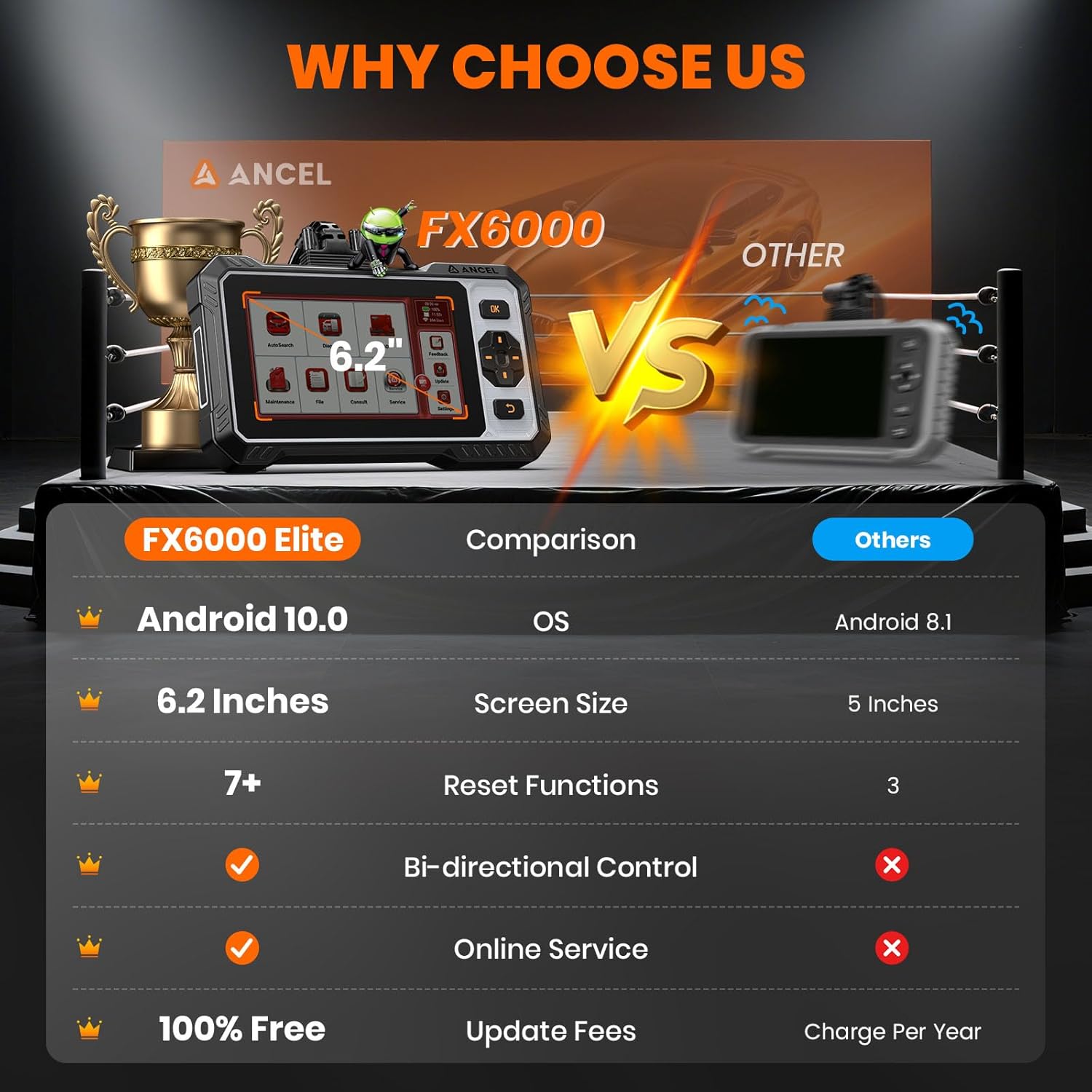 - 【Enhanced Android Performance】2025 New ANCEL FX6000 Elite OBD2 Scanner offers more than basic scanners, it adopted on Android 10.0 OS powered by quad-core processing, letting you install apps, switch tasks seamlessly, and dominate diagnostics. Its intuitive interface beats generic scanners. Equiped with 6.2" HD touchscreen, touch and button dual operation mode, and massive 32GB ROM + 2GB RAM configuration stores 50,000+ diagnostic reports. Rugged enough for garages.