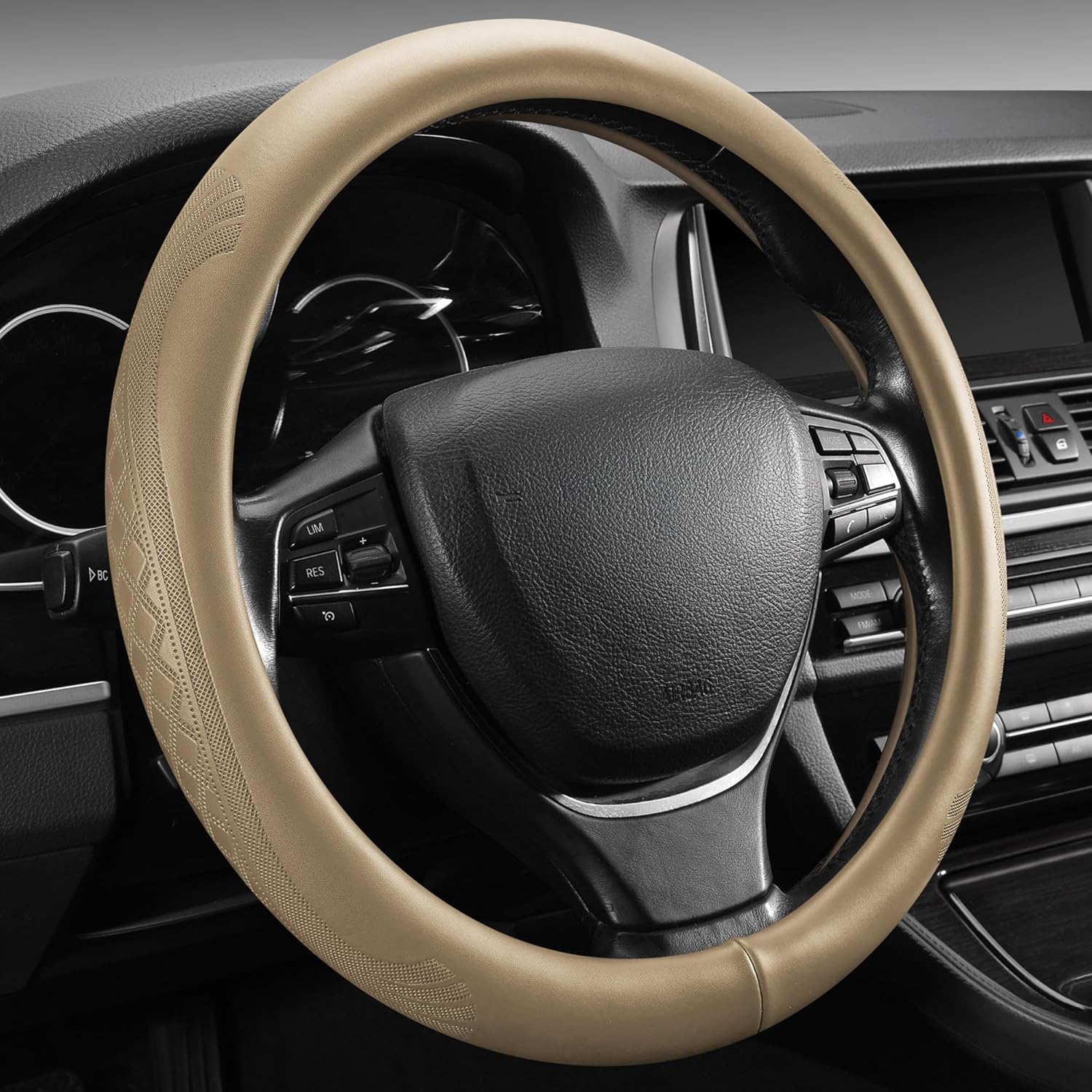 【2025 Model】 High-Grade Real Cowhide Steering Wheel Cover for Men Women,Beige Genuine Leather Steering Wheel Cover for Cars,Universal 14.5-15 inch Steering Wheels,Grid & Square Motif